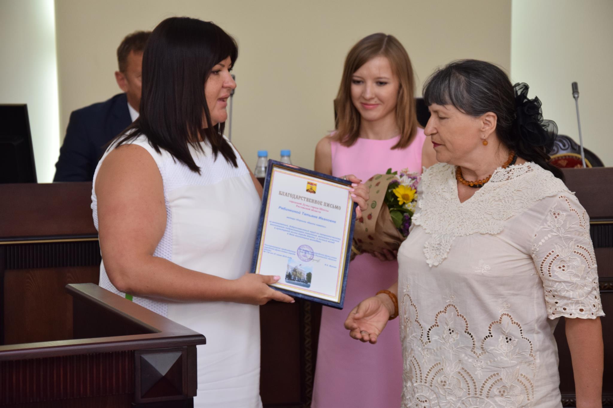 Председатель городской Думы — глава города Шахты Ирина Жукова, выполняя решение комитета по местному самоуправлению, вручила Благодарственное письмо городской Думы города Шахты Татьяне Ивановне Рябинкиной — за многолетний, добросовестный труд по патриотическому воспитанию подрастающего поколения, активное участие в культурной жизни города Шахты и личный вклад в дело воспитания молодёжи.