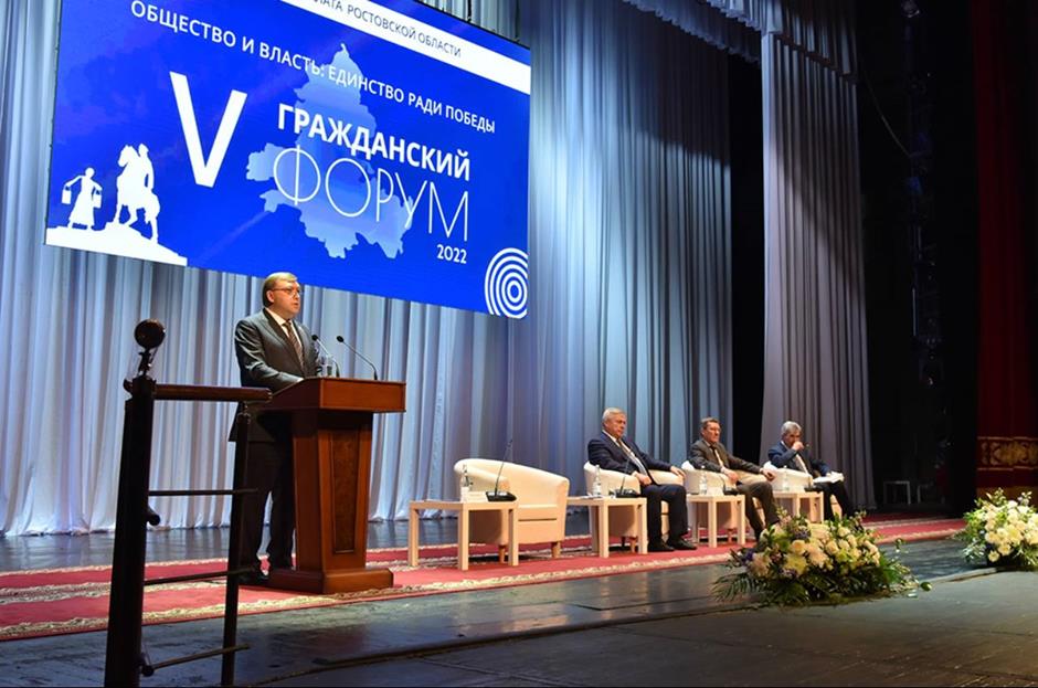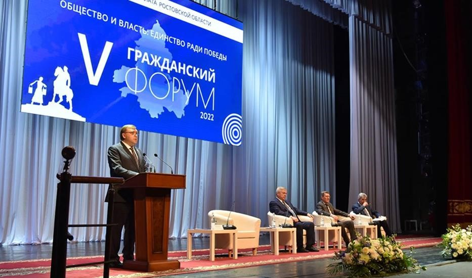 В донской столице прошел V Гражданский Форум Ростовской области «Общество и власть: единство ради победы». Он состоялся с участием губернатора Василия Голубева, председателя Законодательного Собрания РО Александра Ищенко, донских парламентариев и был приурочен к 10-летию Общественной палаты региона.