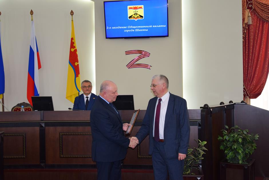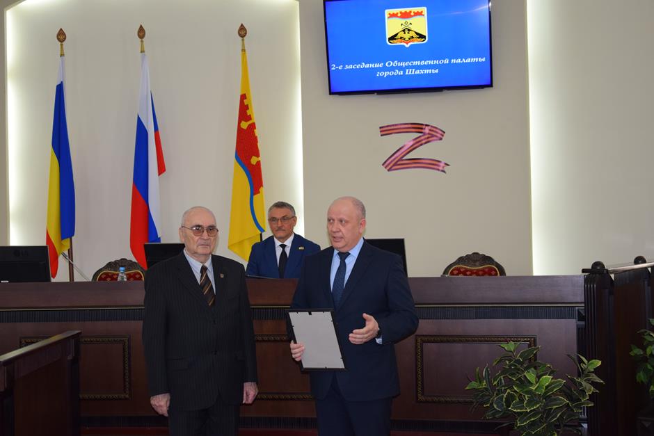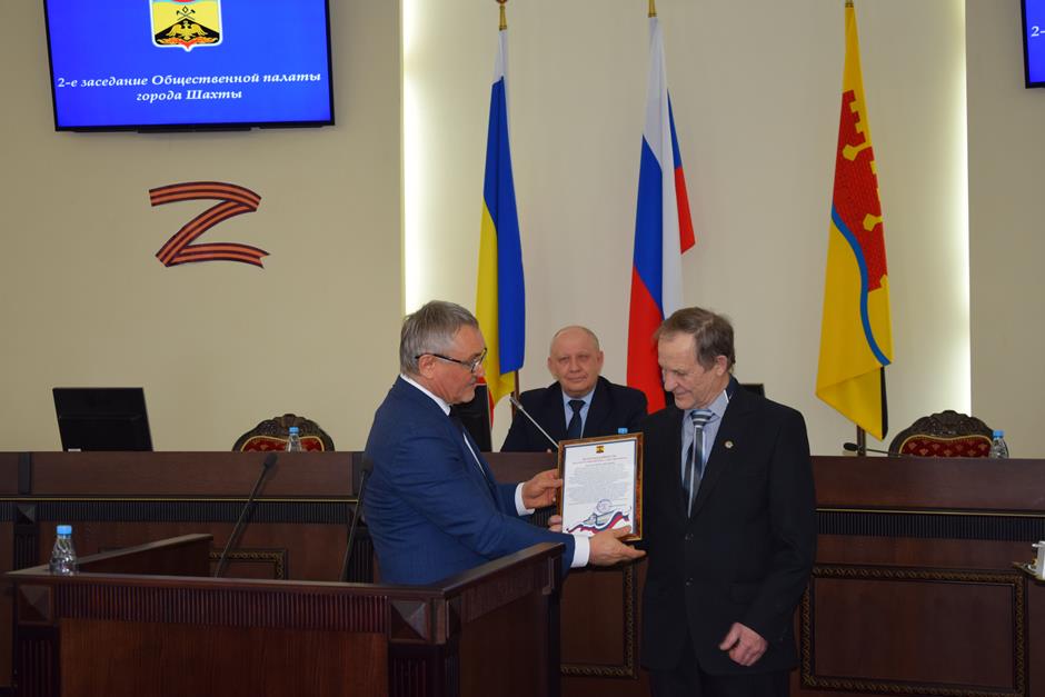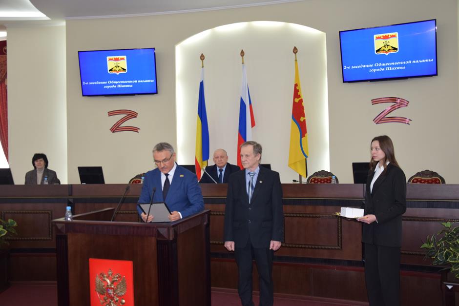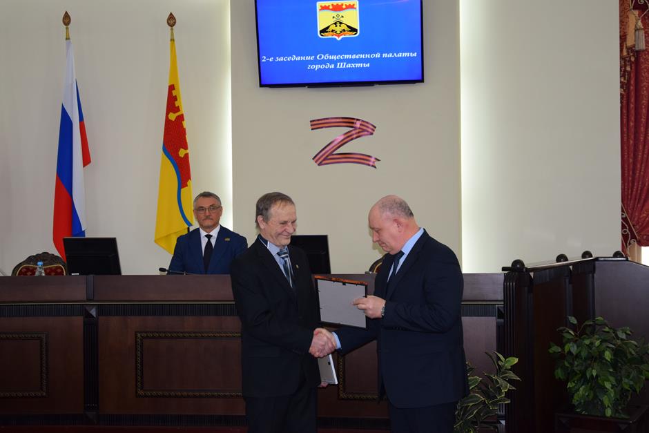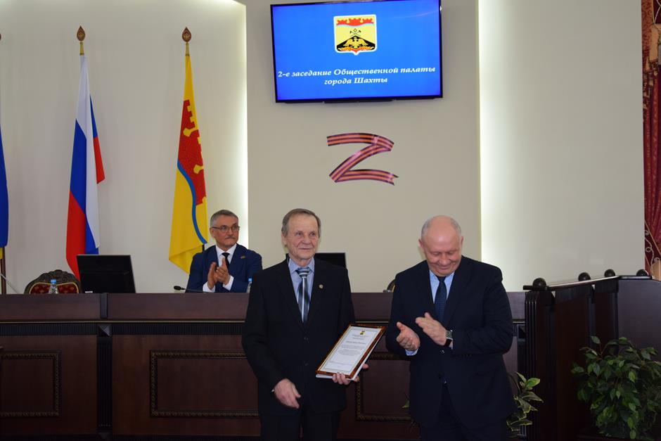 Заседание открыла процедура вручения наград. Благодарности председателя городской Думы — главы города Шахты Андрея Горцевского и ценного подарка удостоен Борис Ляшенко — член Шахтинского городского совета ветеранов (пенсионеров) войны, труда, вооруженных сил и правоохранительных органов, член Общественной палаты города Шахты 2 и 3 созывов. Он также отмечен Благодарственным письмом Администрации города и Почетной грамотой Общественной палаты — за эффективную, многолетнюю работу по воспитанию подрастающего поколения города Шахты, высокий профессионализм в деле совершенствования местного самоуправления и значительный вклад в развитие институтов гражданского общества