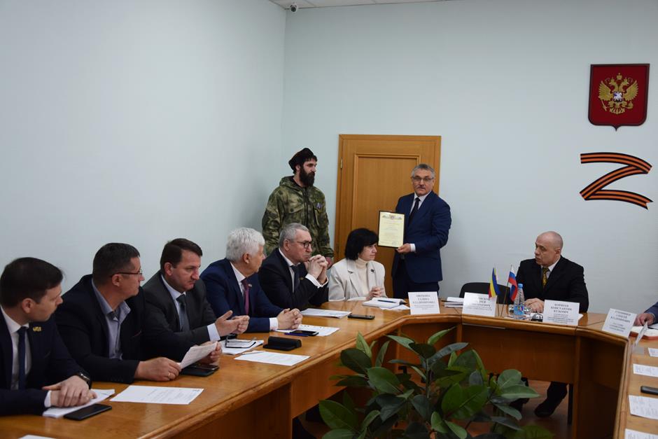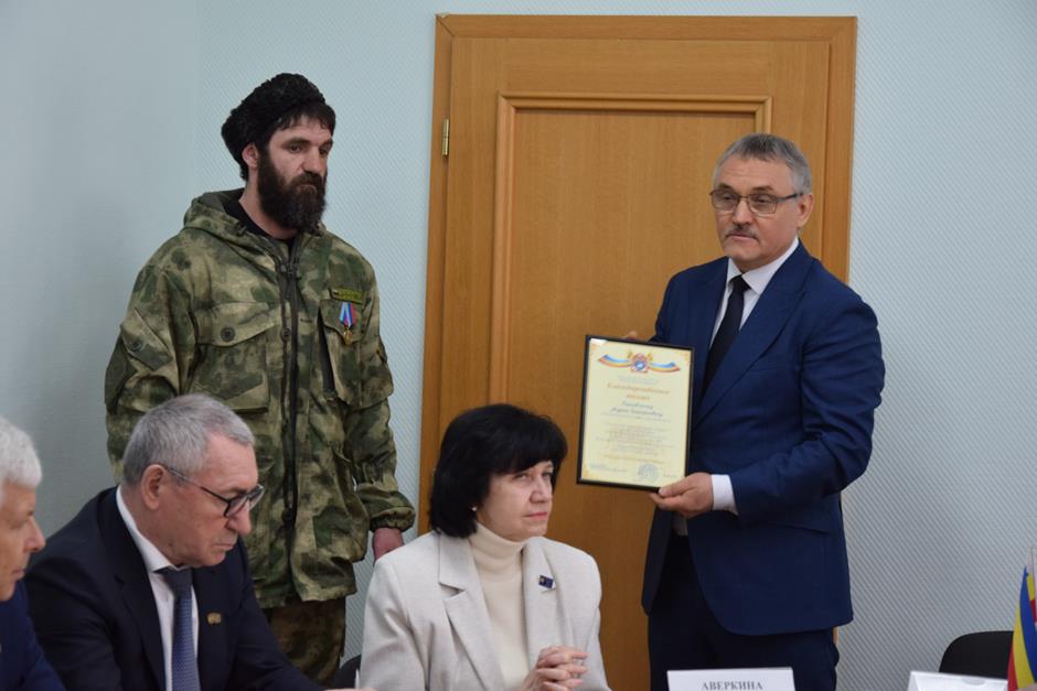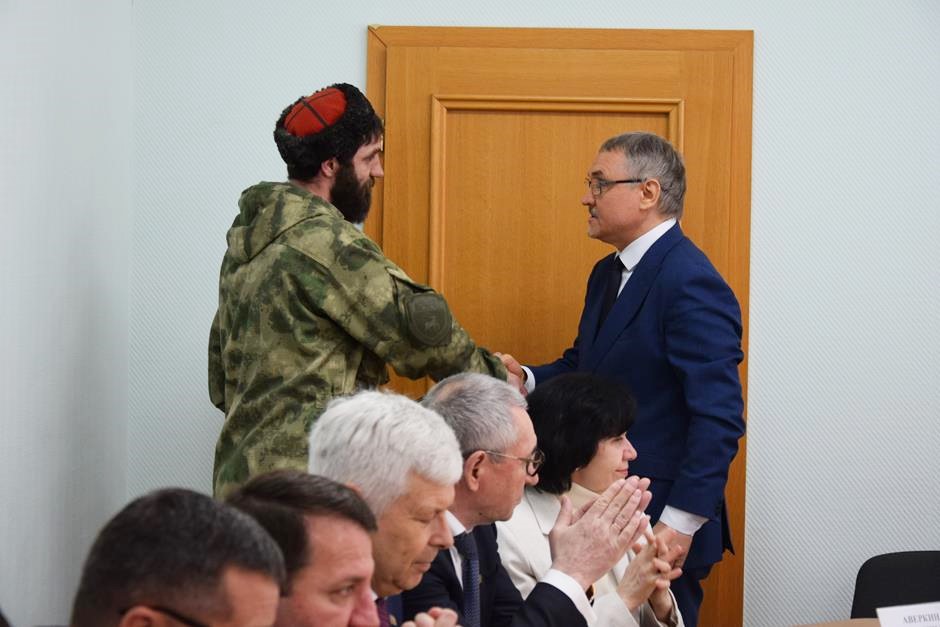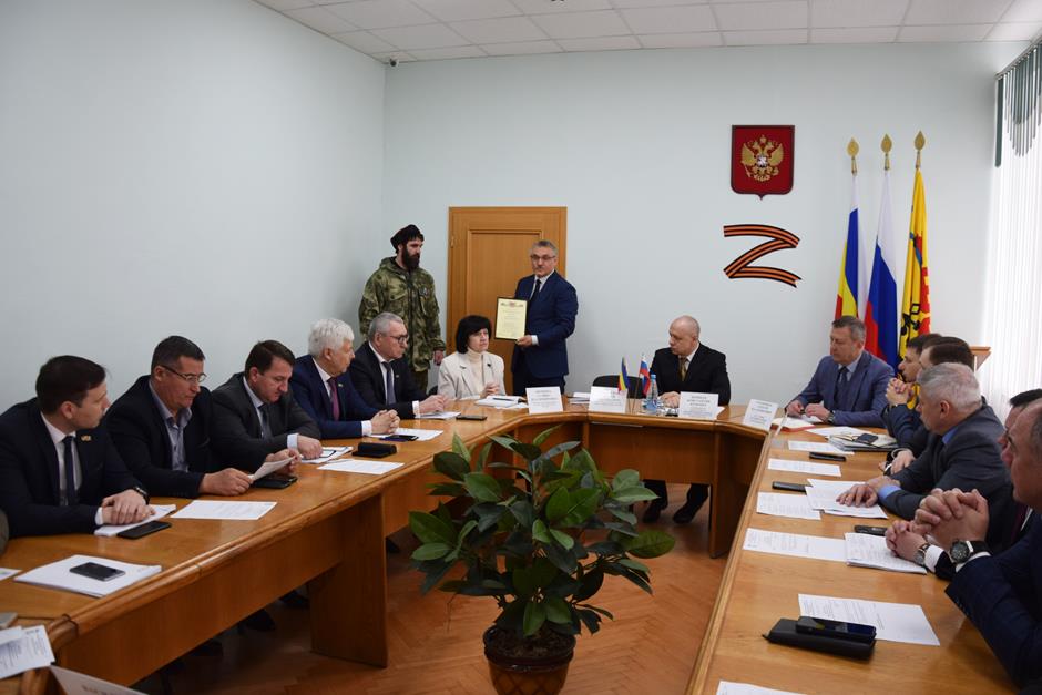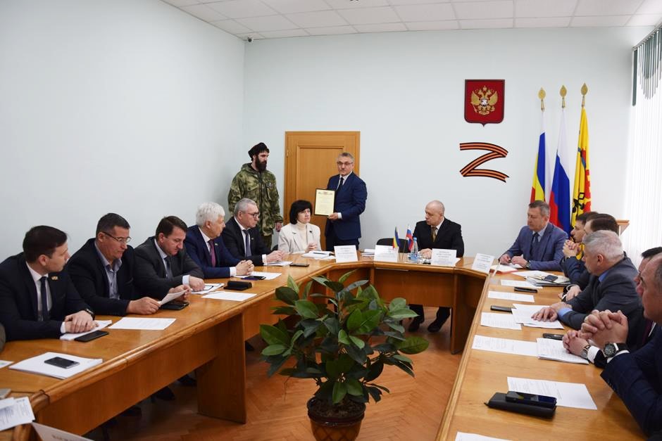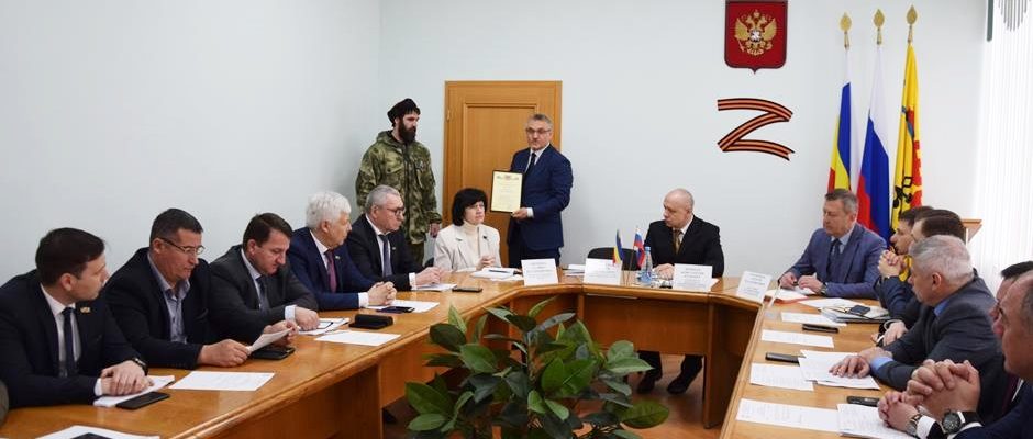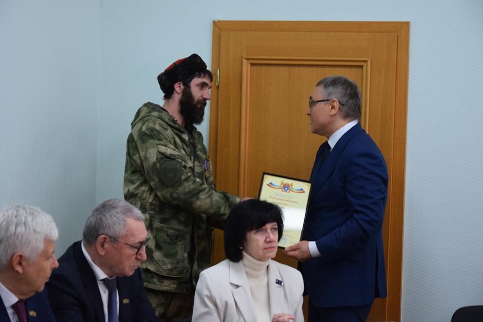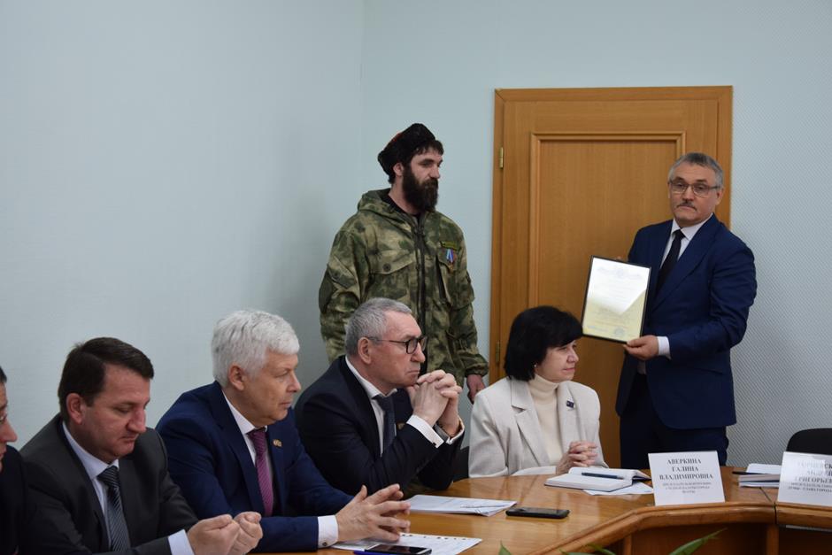 Представители Международного казачьего Союза области Войска Донского прибыли на заседание, чтобы поблагодарить депутатский корпус и лично председателя Думы – главу города Шахты за поддержку участников СВО. Атаман Дмитрий Боюн передал награду спикеру городской Думы Андрею Горцевскому, который в свою очередь подчеркнул, что оказание помощи будет продолжено.