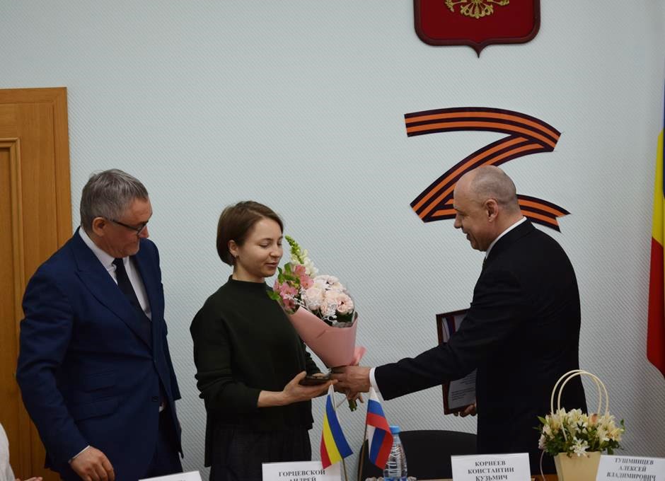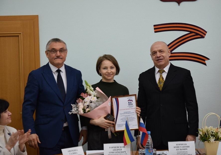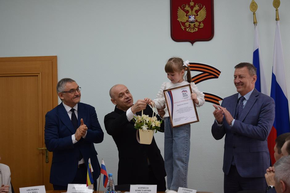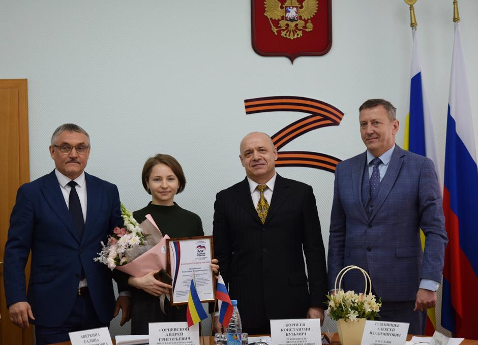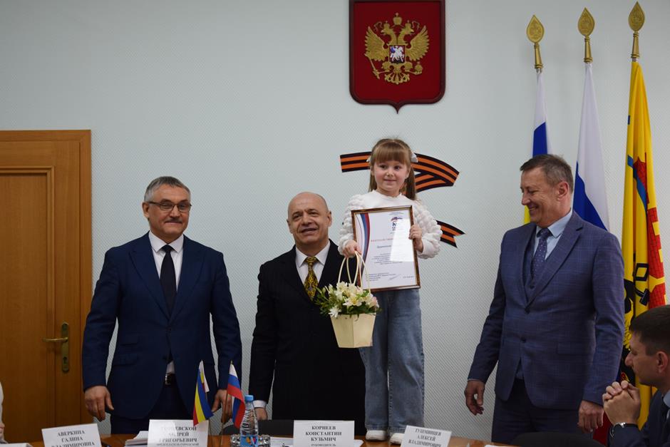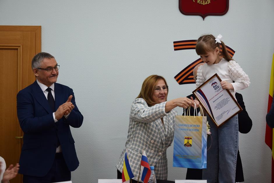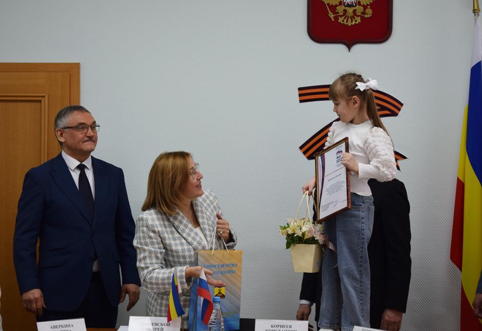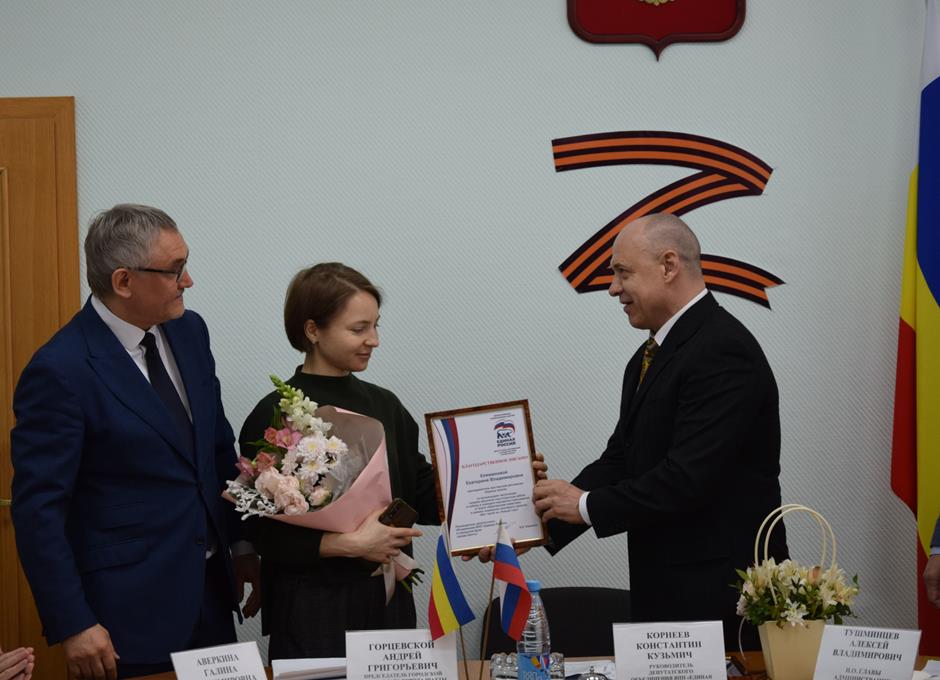 Открылось заседание вручением Благодарственных писем депутатского объединения ВПП «ЕДИНАЯ РОССИЯ» победителям конкурсов народного голосования в «Шахтинских известиях». Награды получили: преподаватель мастерской рисования «Курица лапой» Екатерина Климанова — за организацию экспозиции галереи рисунков под открытым небом в рамках социально-значимого проекта «Вот такой он, Новый Год!», а также юная художница из детского сада №76 Эмилия Дудинская.