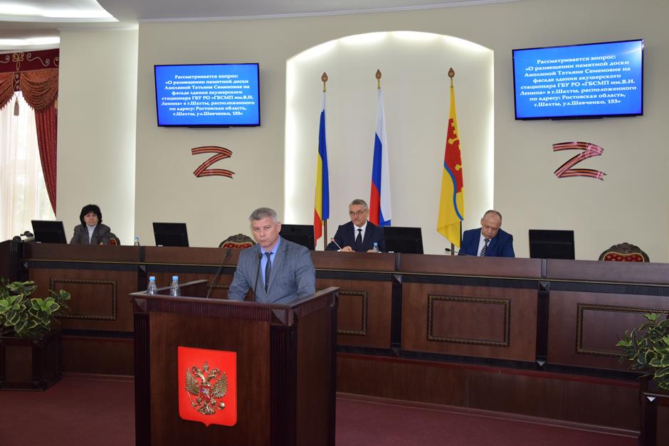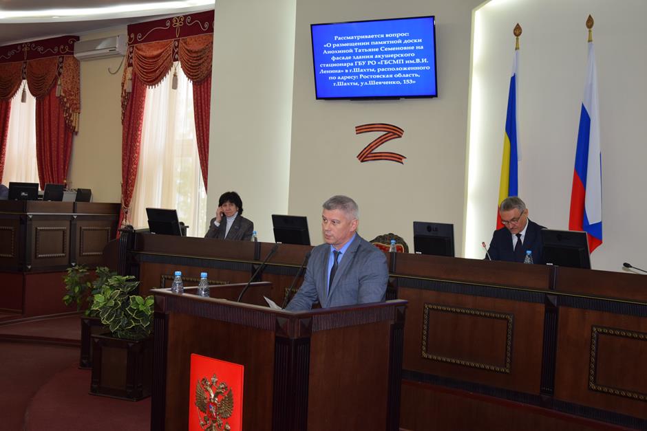 При рассмотрении вопроса №16 депутаты согласовали размещение памятной доски Анохиной Татьяне Семеновне на фасаде здания акушерского стационара ГБУ РО «ГБСМП им.В.И. Ленина» (ул.Шевченко, 153).Более полувека Татьяна Анохина отдала работе в больнице имени В.И. Ленина, она удостоена званий «Заслуженный врач Российской Федерации», «Почетный донор России», является грамотным и авторитетным наставником, отметил в своем выступлении главный врач «ГБСМП им.В.И. Ленина», председатель комитета городской Думы города Шахты по социальной политике Виталий Фомин.
