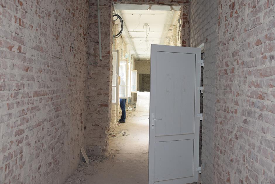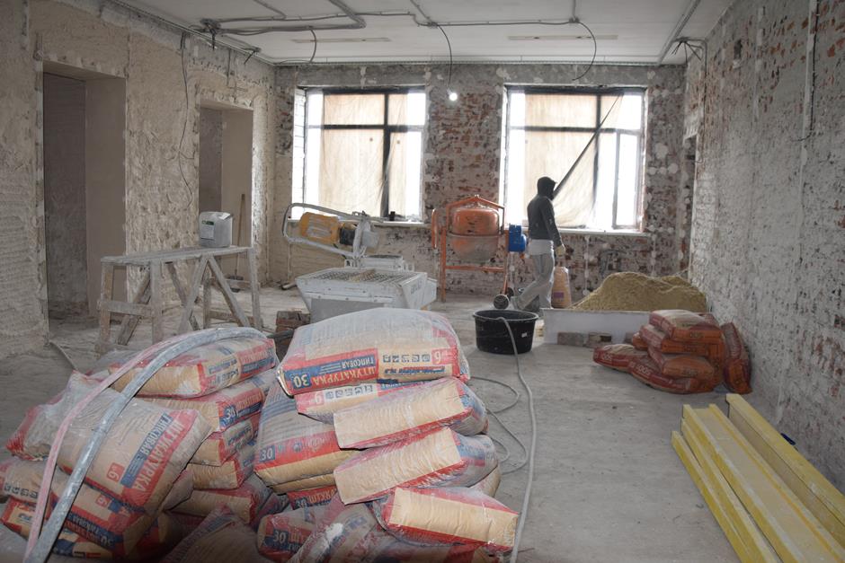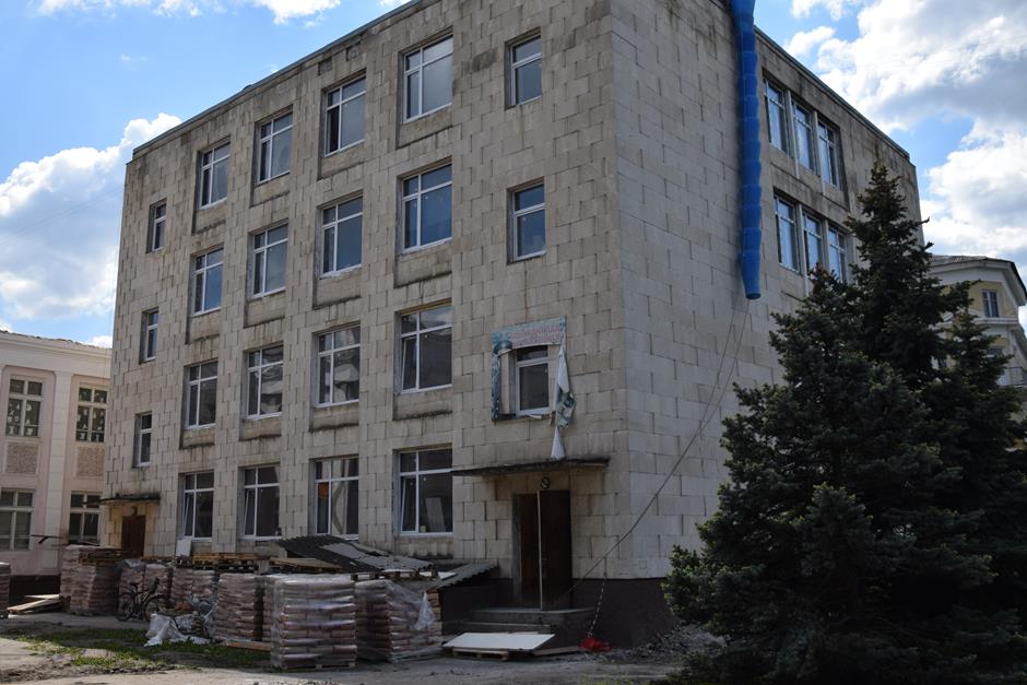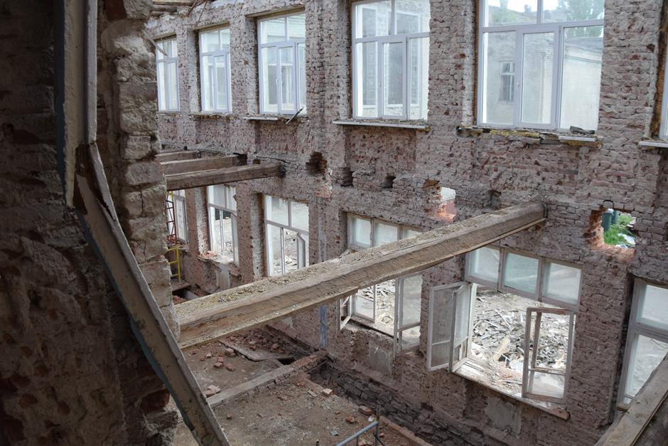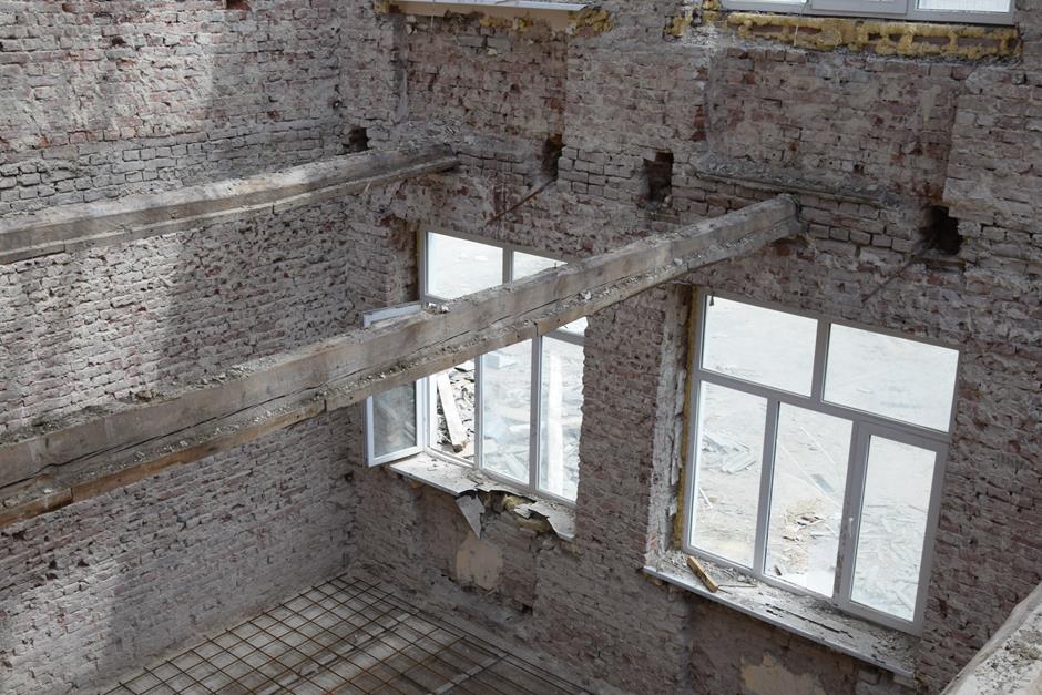 На текущую дату подрядной организацией демонтированы внутренние инженерные коммуникации, оконные и дверные блоки. Установлены металлопластиковые окна. В настоящее время выполняется устройство фасадов, кирпичная кладка перегородок, усиление проемов.