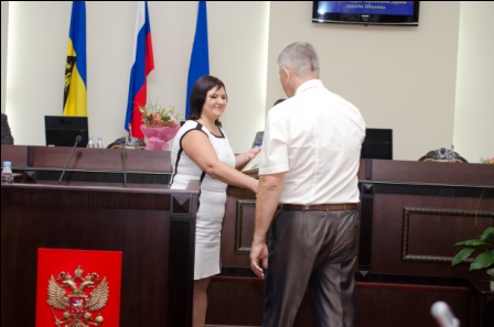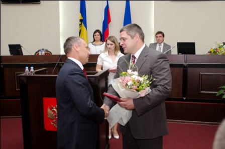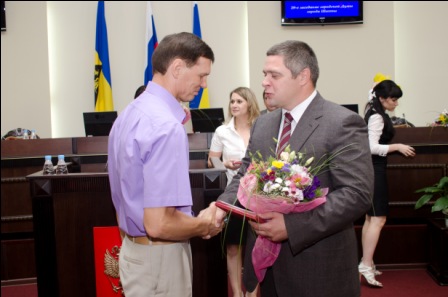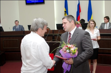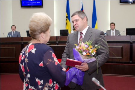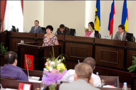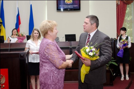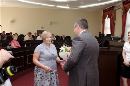 Заседание началось с вручения мэром Д.И.Станиславовым памятного знака «75 лет Ростовской области» достойным гражданам, внёсшим большой вклад в развитие города, формирование общественных институтов и представительной власти: В.Н.Бездняковой – с 1997 г. по 2010 г. – управляющей делами городской Думы; Т.А.Буланцевой – ген.директору ООО «ШахтФарм», депутату двух созывов; И.А.Жуковой – председателю городской Думы, депутату трёх созывов; Д.В.Кравцову – президенту правления некоммерческого партнёрства «Саморегулируемой организации «Объединение автомобильных перевозчиков «Южный регион», депутату городской Думы; В.И.Локтионову – с 1997г.по 2001г. председателю городской Думы; И.В.Минчинской – генеральному директору ОАО «Фармация», депутату городской Думы; А.В.Романовскому – директору ООО «Ритуал», депутату трёх созывов; А.А.Рябову – главному врачу МУЗ ГБСМП им.Ленина, депутату городской Думы; С.М.Фандееву – управляющему делами городской Думы; Л.Д.Черновой – председателю Думы с 2005 по 2010г.; Г.И.Чувашёвой – заведующей поликлиникой №1 МБУЗ ГБ, депутату городской Думы с 2001г. по 2005г. И ещё два знака будут вручены, А.В.Осовскому – депутату городской Думы с 2001г. по 2005г. (отсутствовал по состоянию здоровья) и представляющему Россию на Олимпийских играх в Лондоне А.А.Сильнову – Почётному гражданину города, двукратному чемпиону Кубка Европы, чемпиону Олимпийских игр в Пекине, депутату городской Думы.