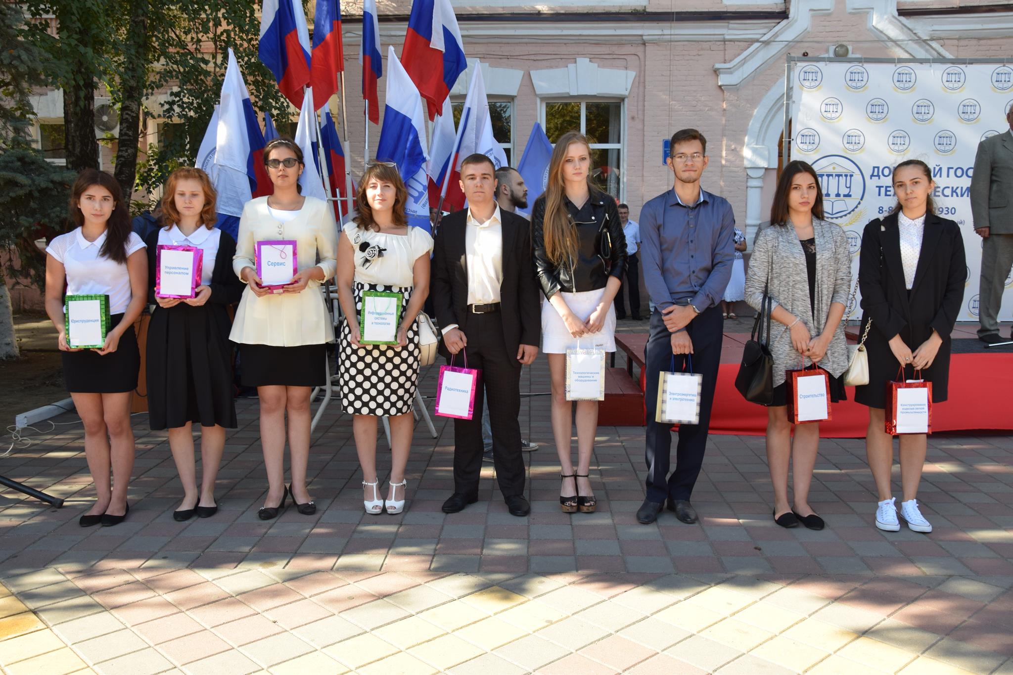 На площади перед университетом собралось новое поколение студентов-первокурсников — немного растерянных, взволнованных, ещё сохраняющих внешний вид вчерашних школьников: белый верх, тёмный низ. В этом году шахтинский филиал ДГТУ набрал около двух тысяч студентов! Это очень хороший показатель, укрепляющий позиции образовательного учреждения как одного из самых востребованных и популярных в городе.