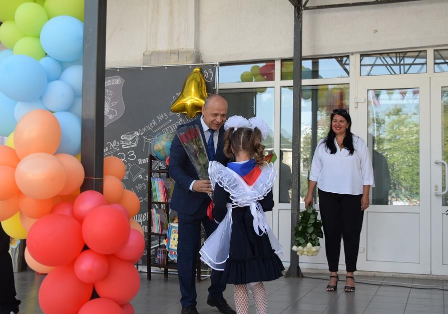 Директору лицея №3 Константин Корнеев вручил цветы, первоклассникам — билеты на посещение парка птиц «Малинки».