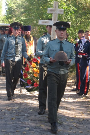 В этот солнечный тёплый день на центральной аллее кладбища выстроился «живой коридор» из кадетов и участников игры «Отвага», они ожидали человека, который спустя десятилетия должен был отправиться в свой последний путь так, как следует быть погребённому солдату… Под звуки поминального звона гроб с останками солдата военнослужащие на руках пронесли к месту отпевания и митинга памяти. Директор департамента культуры С.Н.Морозова рассказала о том, что в ходе подготовки ходатайства на имя президента РФ о присвоении городу Шахты почётного звания «Город воинской славы» и в период подготовки к празднованию юбилейного 70-го праздника «Дня Победы», Администрация города приняла решение о выявлении всех ранее неучтённых мест воинских захоронений. Это необходимо для последующей процедуры перезахоронения со всеми воинскими почестями. И вот в этот день проводится одно из таких перезахоронений останков погибших во время Великой Отечественной войны.