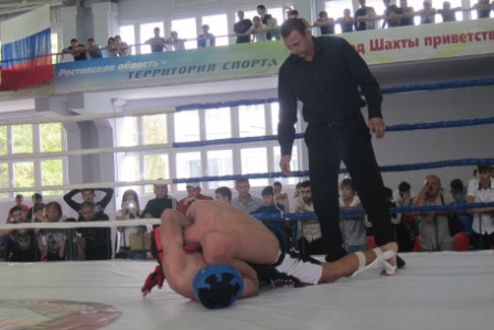 В середине легкоатлетического манежа был установлен ринг, на котором сразу после торжественной церемонии открытия и начались бои. Расписание чемпионата составлено на два дня, с тем, что 23 сентября в вечерней программе состоятся восемь финальных поединков и зрители увидят два профессиональных боя. О целях и задачах чемпионата мы попросили рассказать исполнительного директора Ростовского филиала Российского союза боевых искусств по югу России И.В.Таракина:
