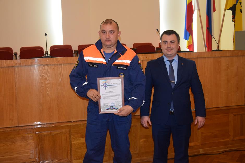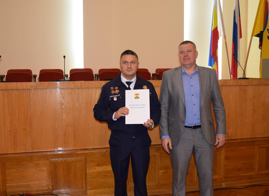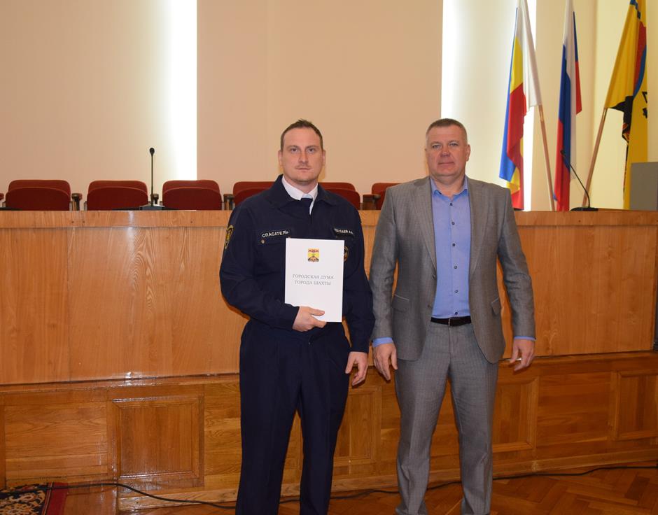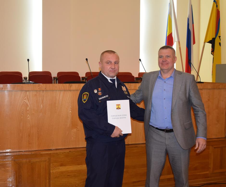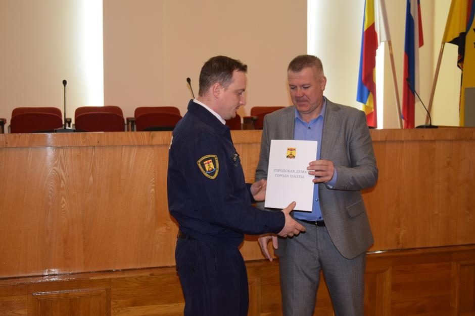 Депутатским корпусом отмечены 6 сотрудников МКУ г.Шахты «Управление по делам ГО ЧС». Благодарственные письма городской Думы вручил председатель комитета городской Думы по жилищно-коммунальному хозяйству Андрей Ермаков. Поощрения за высокий профессиональный уровень в деле обеспечения предупреждения и ликвидации чрезвычайных ситуаций на территории города Шахты удостоены начальники поисково-спасательной группы Роман Воронин и Юрий Рыжков, спасатели Максим Сафронов, Кирилл Тараканов и Александр Чебулаев, механик-водитель Владислав Акулиничев.