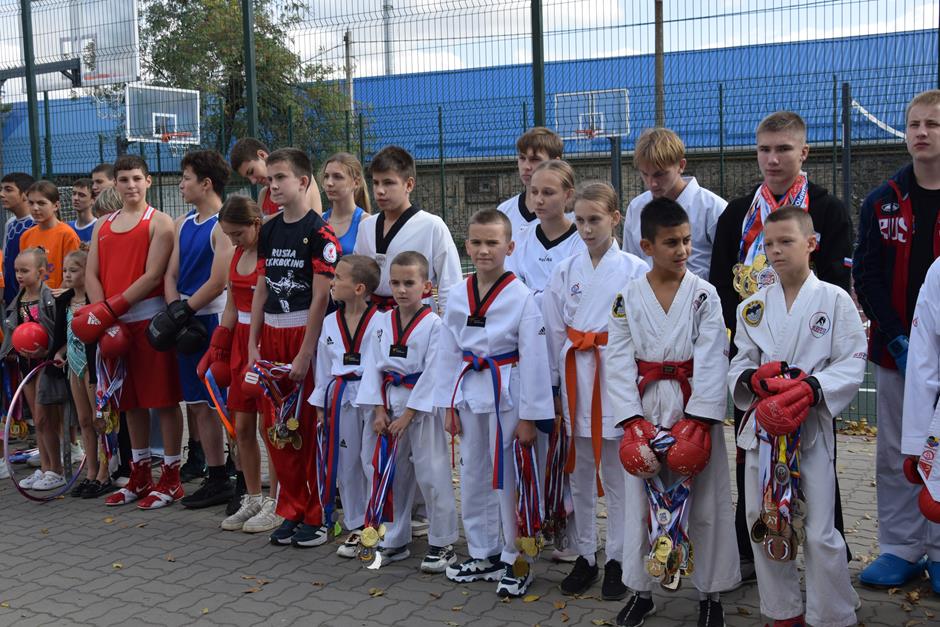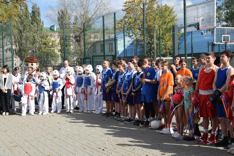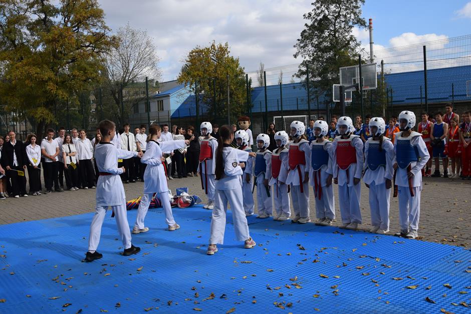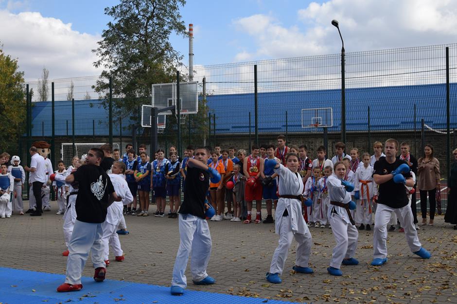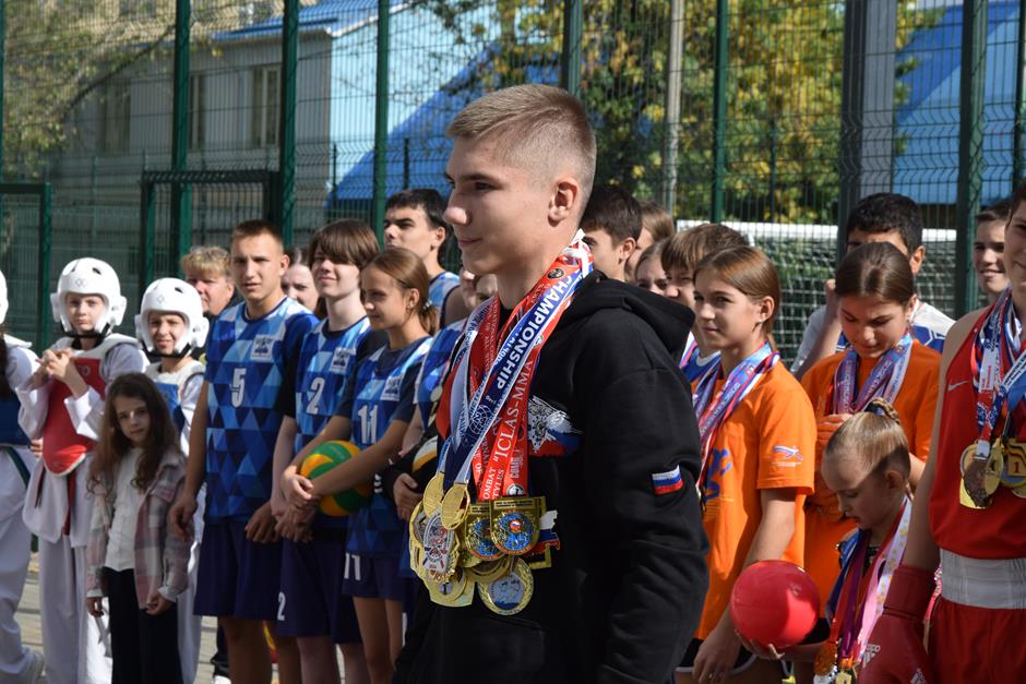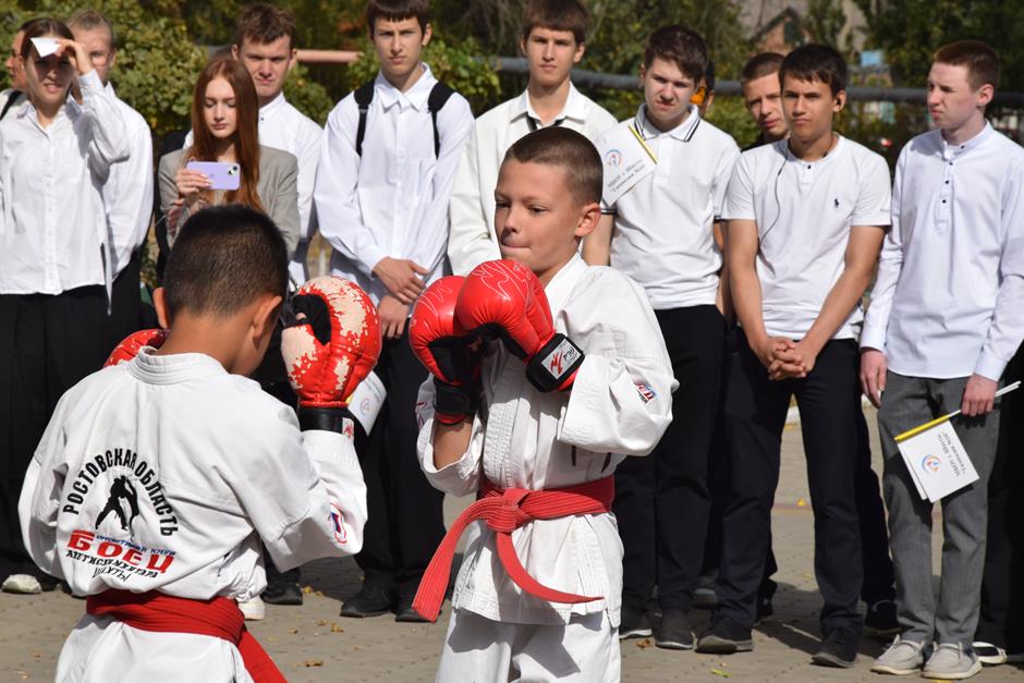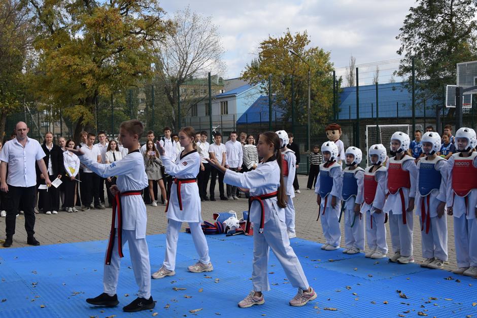 Гимназисты-спортсмены: волейболисты, футболисты, легкоатлеты, боксеры, гимнасты, тхэквондисты, «рукопашники» и каратисты выступили с показательными номерами. Мастерство боевых искусств продемонстрировали воспитанники клубов «Кумган» и «Арес».
