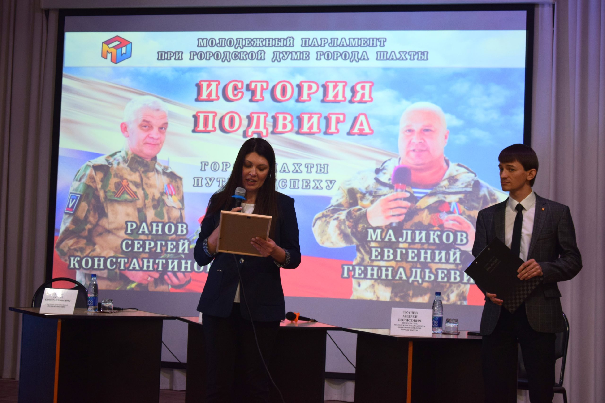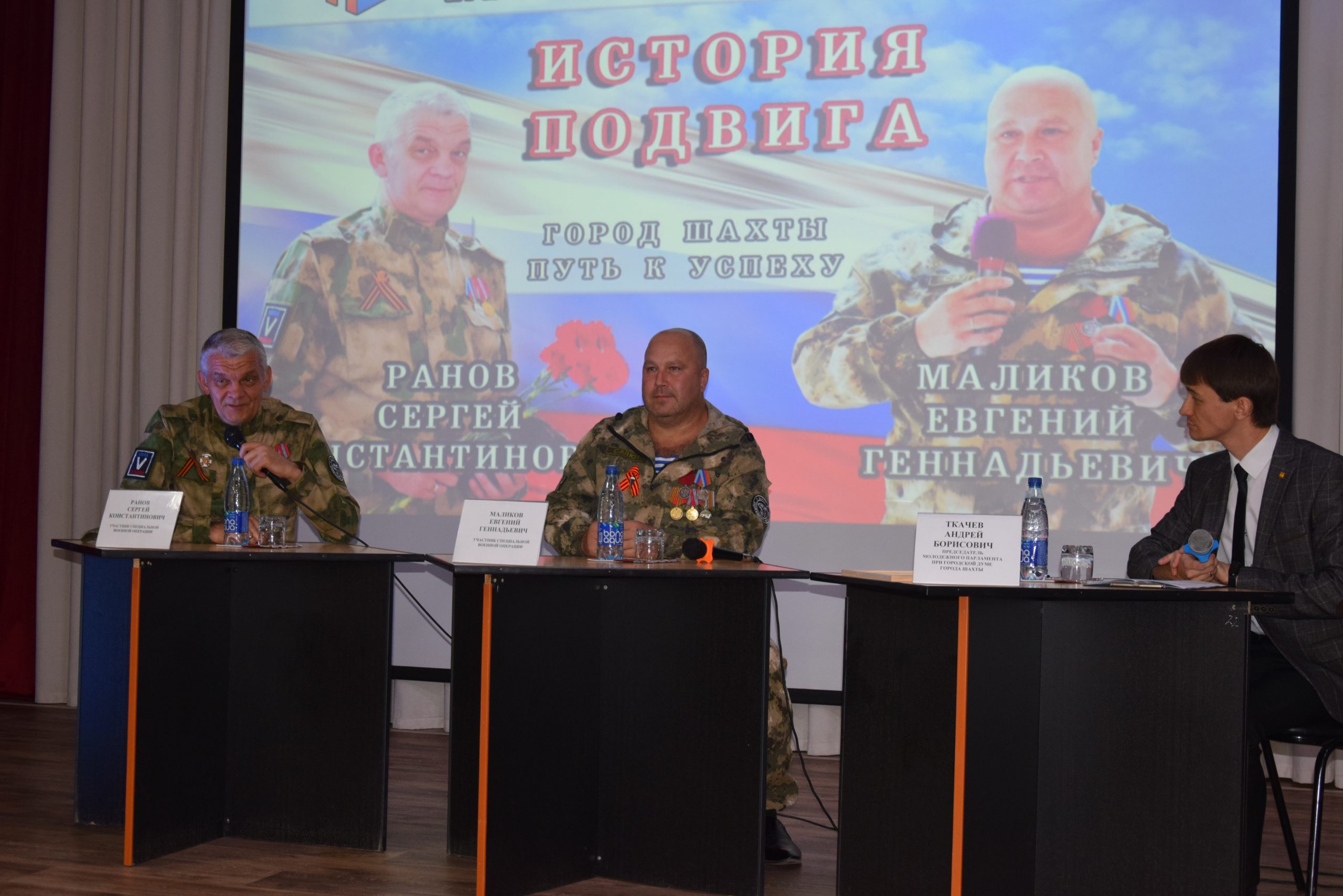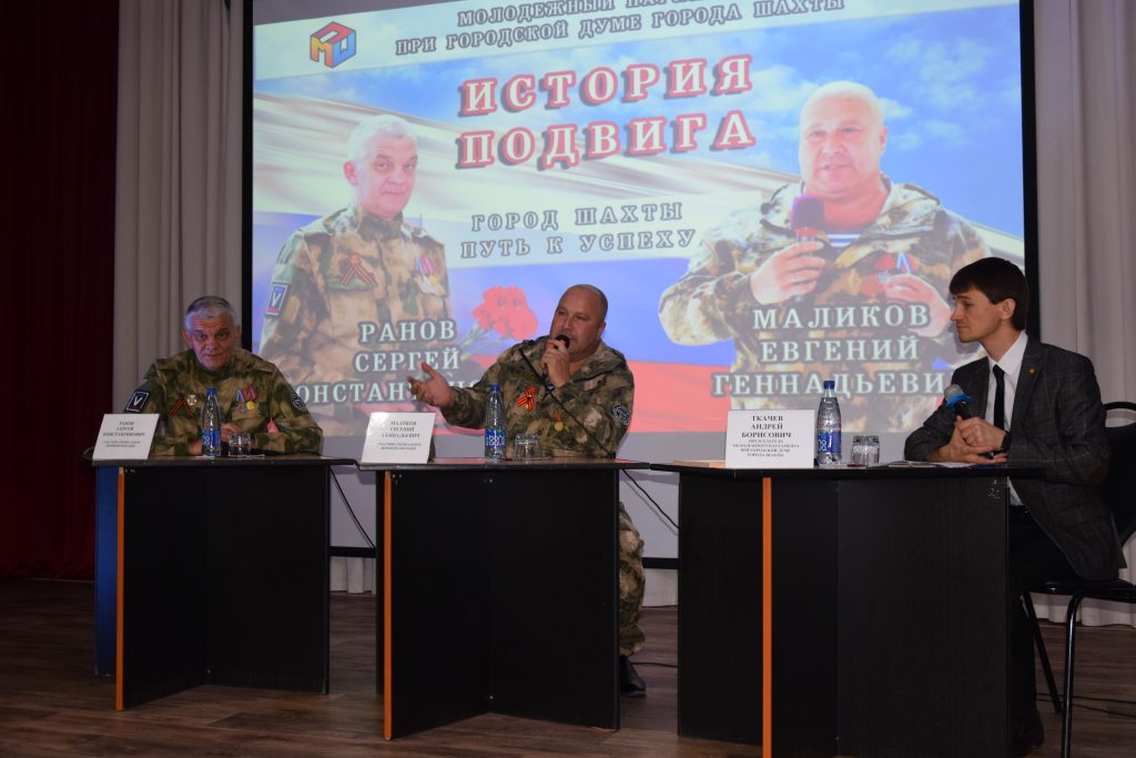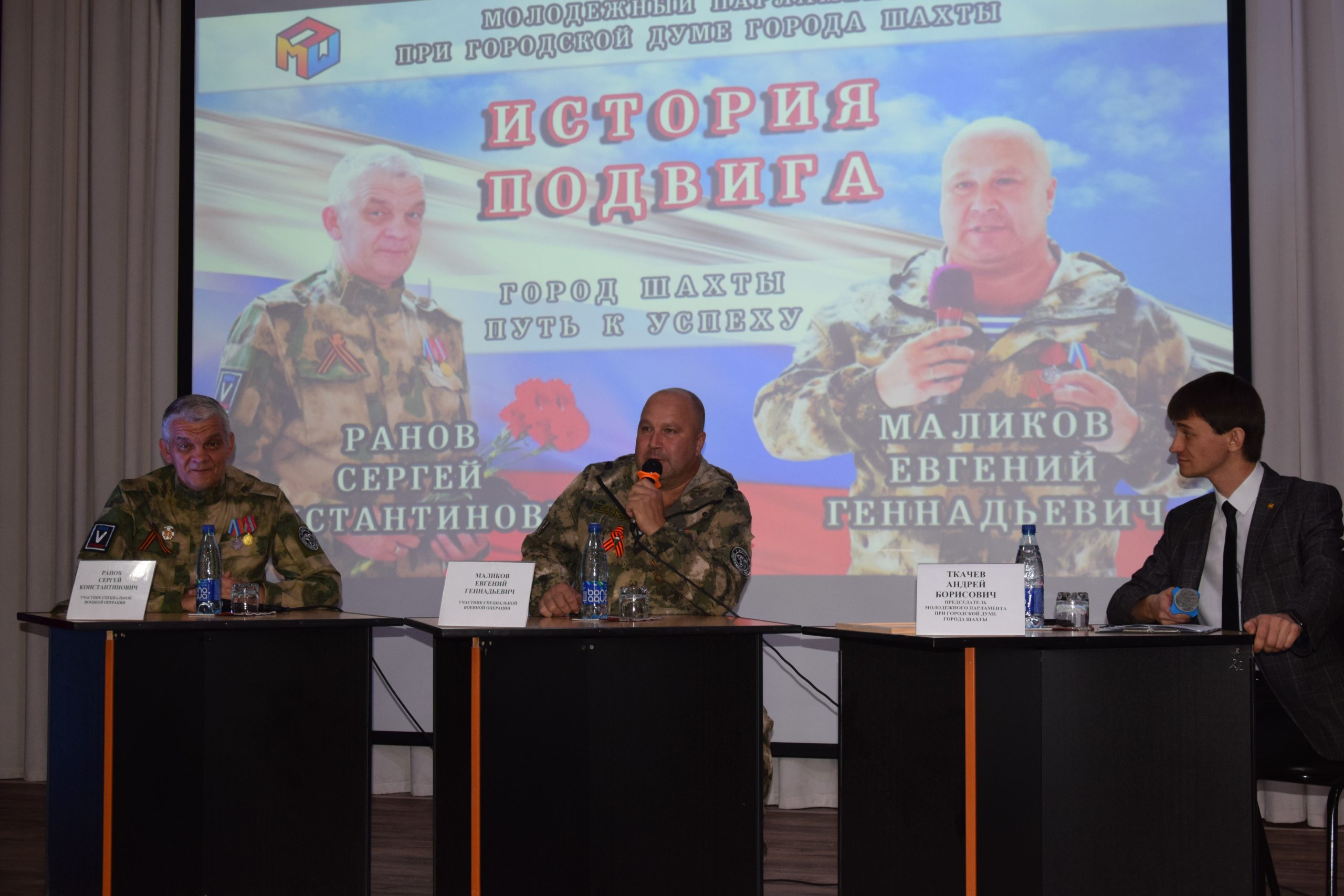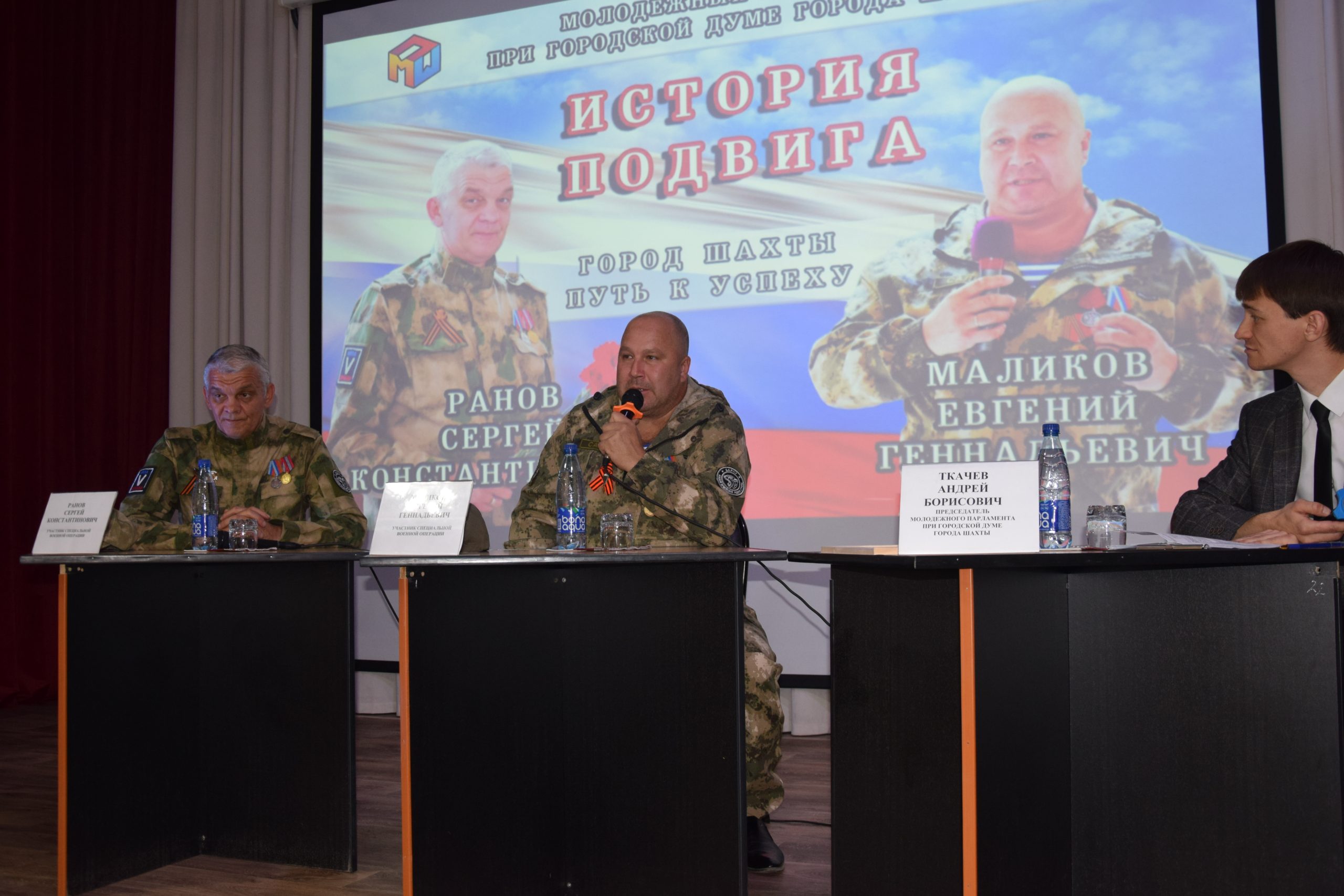 «История Подвига» — это открытый диалог между подрастающим поколением и защитниками Отечества, организованный Молодежным парламентом при городской Думе. Он состоялся в рамках проекта МПШ «Город Шахты. Путь к успеху». Главными героями встречи в стенах шахтинского регионального колледжа топлива и энергетики им. ак. Степанова П.И. стали участники специальной военной операции Сергей Ранов (награжден медалью «За боевые заслуги») и Евгений Маликов (удостоен медали ордена «За заслуги перед Отечеством» II степени).