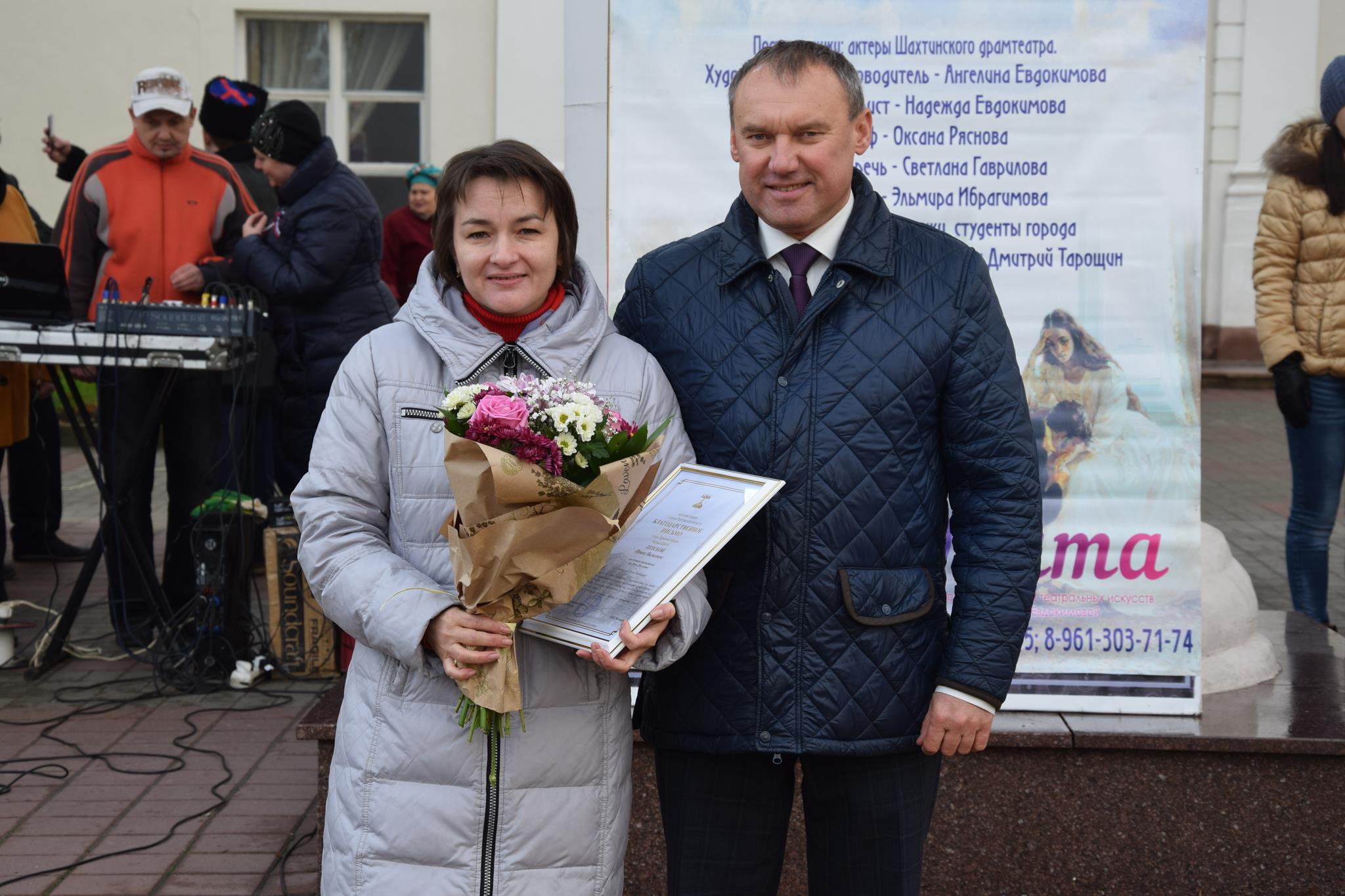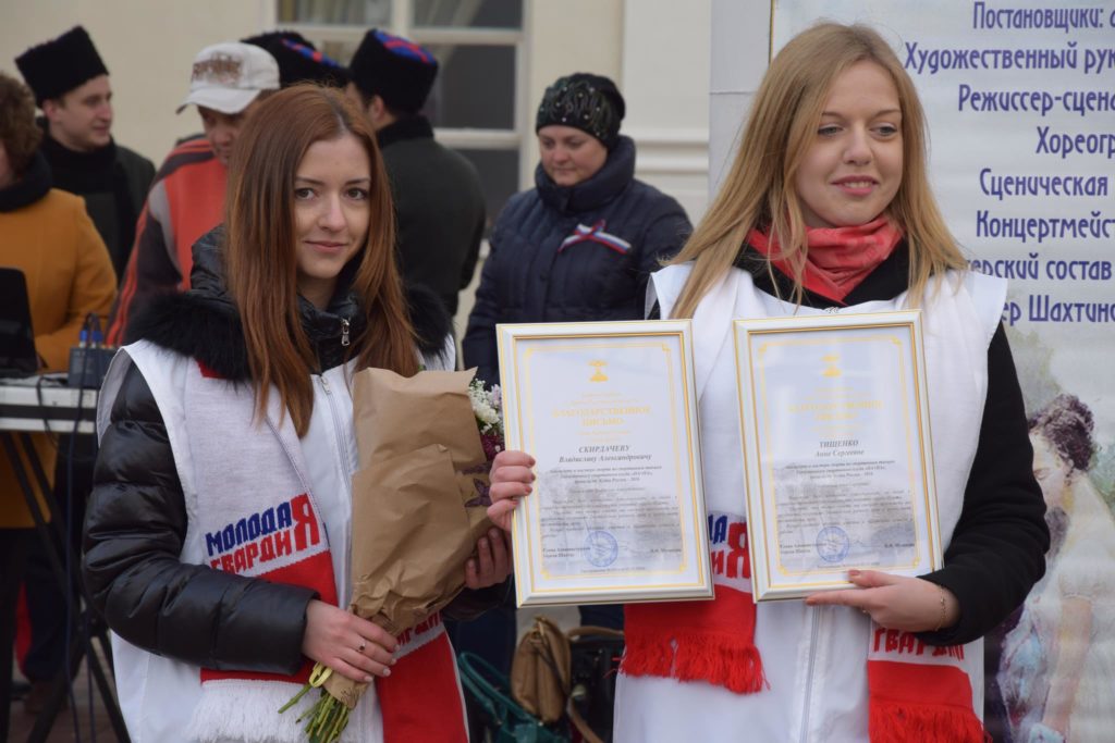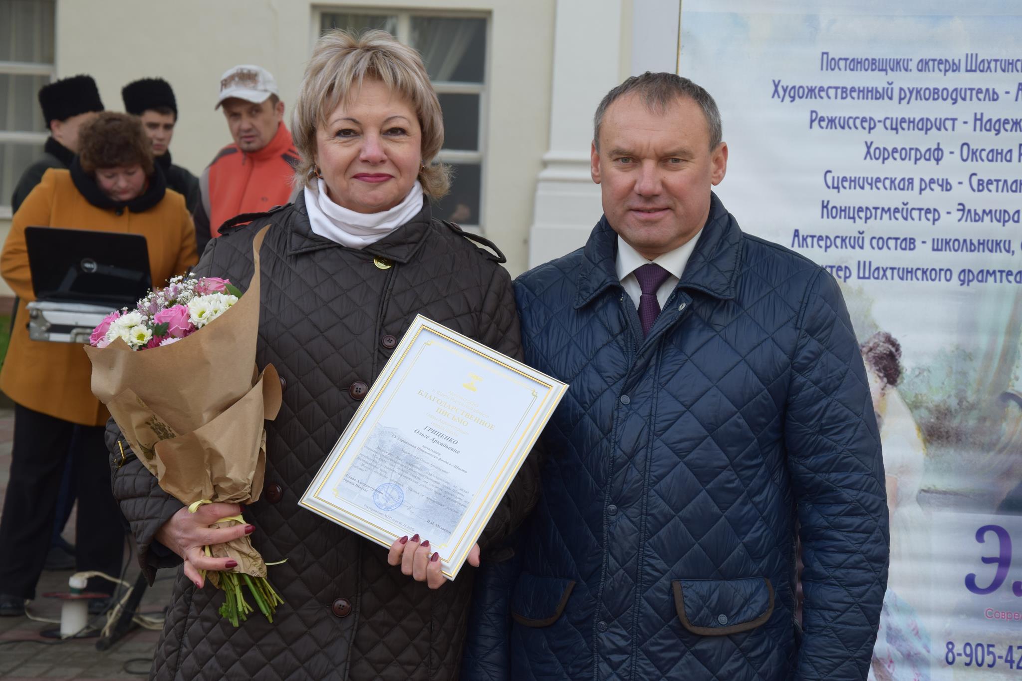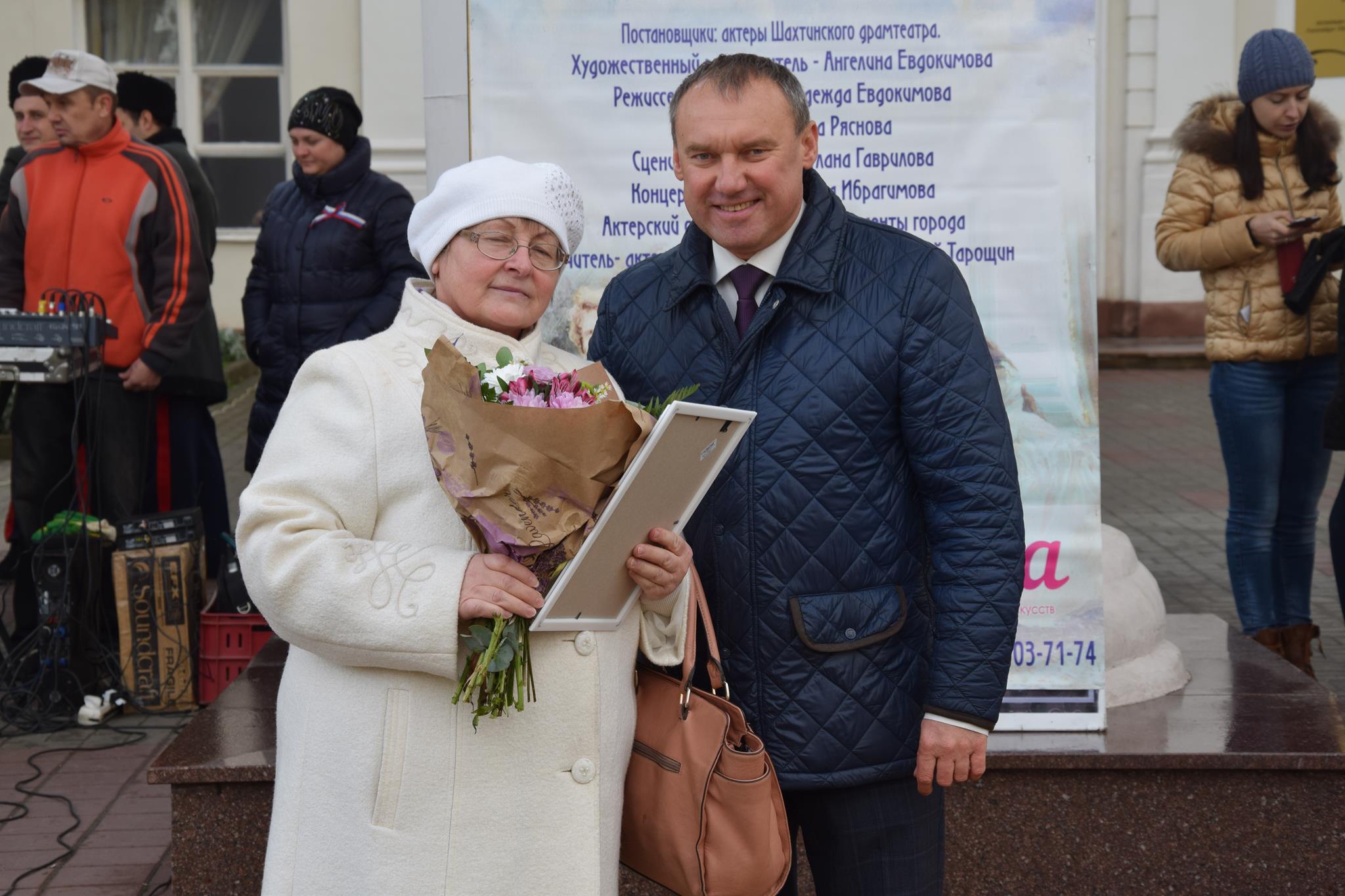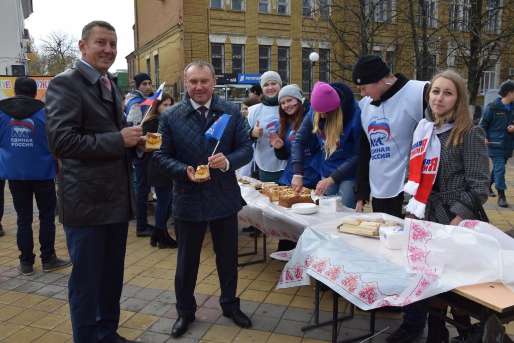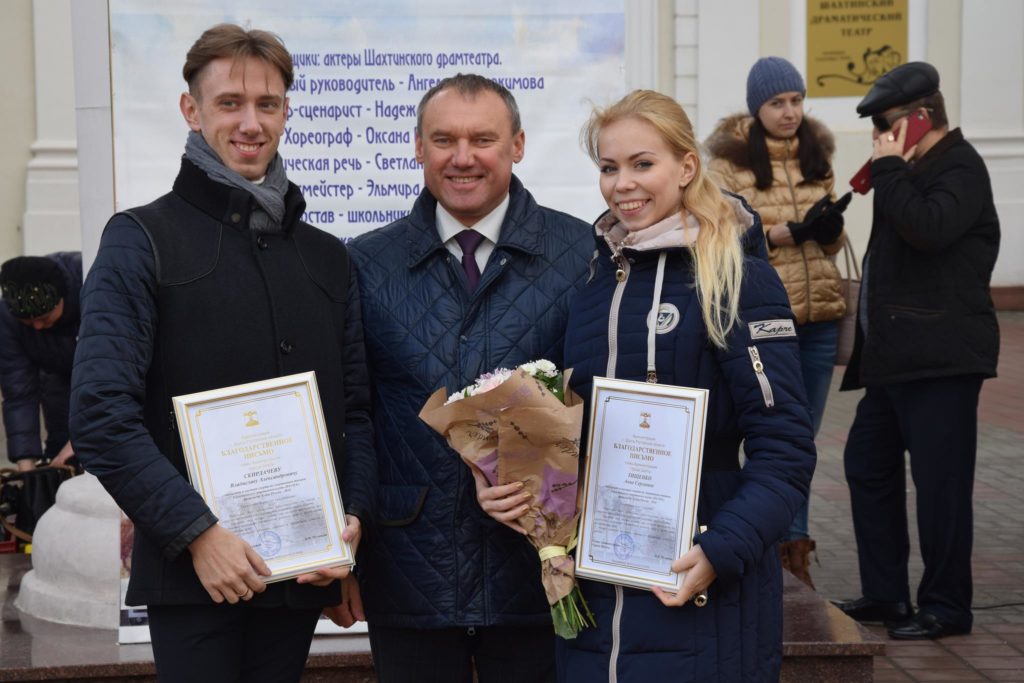 Алексей Тушминцев, Дмитрий Кравцов и Владимир Жемойтель вручили Благодарственные письма достойным шахтинцам, коллектив муниципального ансамбля «Надежда» и другие талантливые артисты подарили присутствующим замечательные песни. А члены Молодой гвардии угощали присутствующих очень вкусными пирогами, приготовленными специально для этого праздника на хлебопекарном предприятии семьи Кундрат.