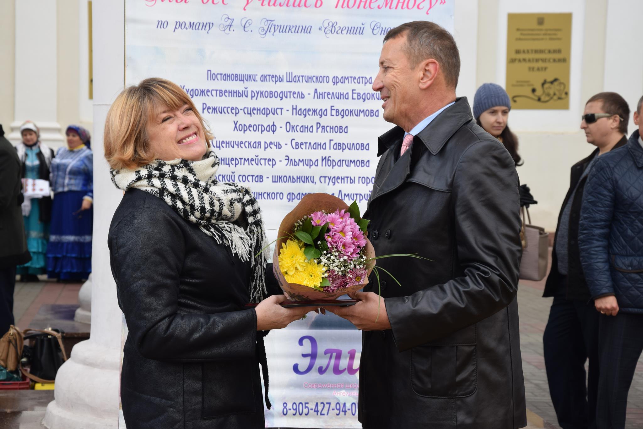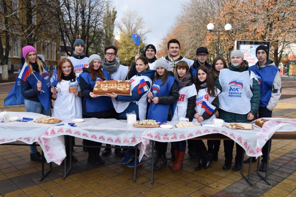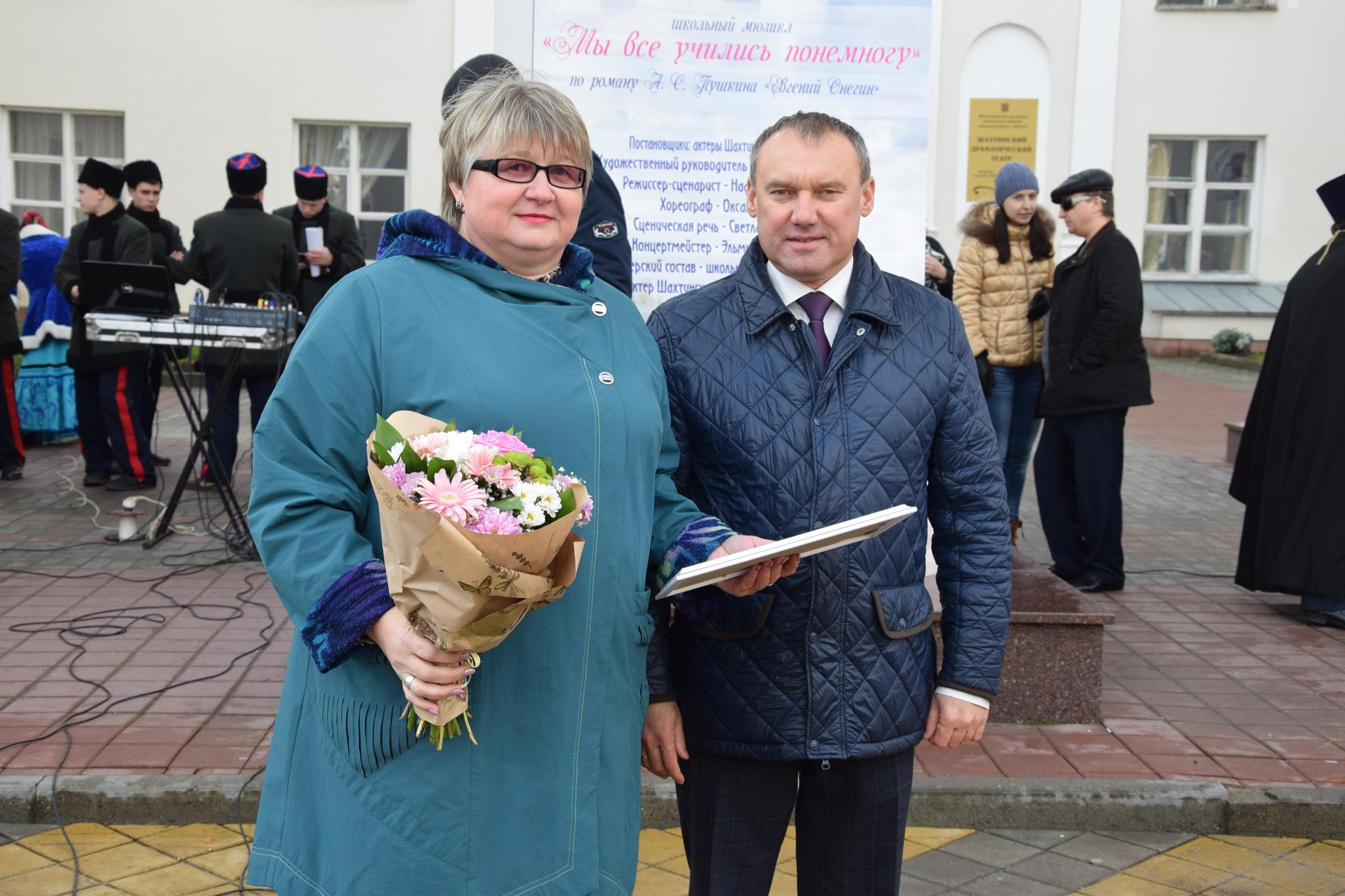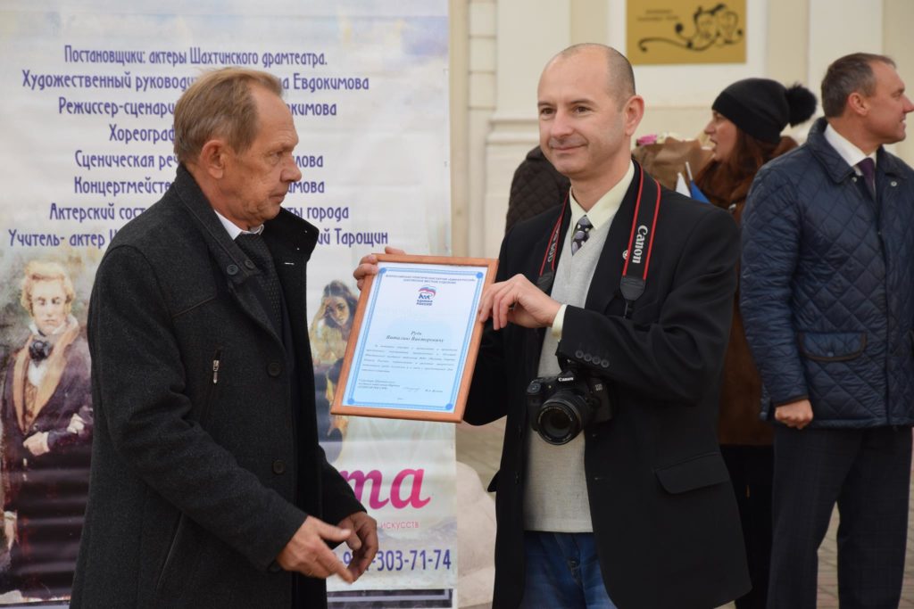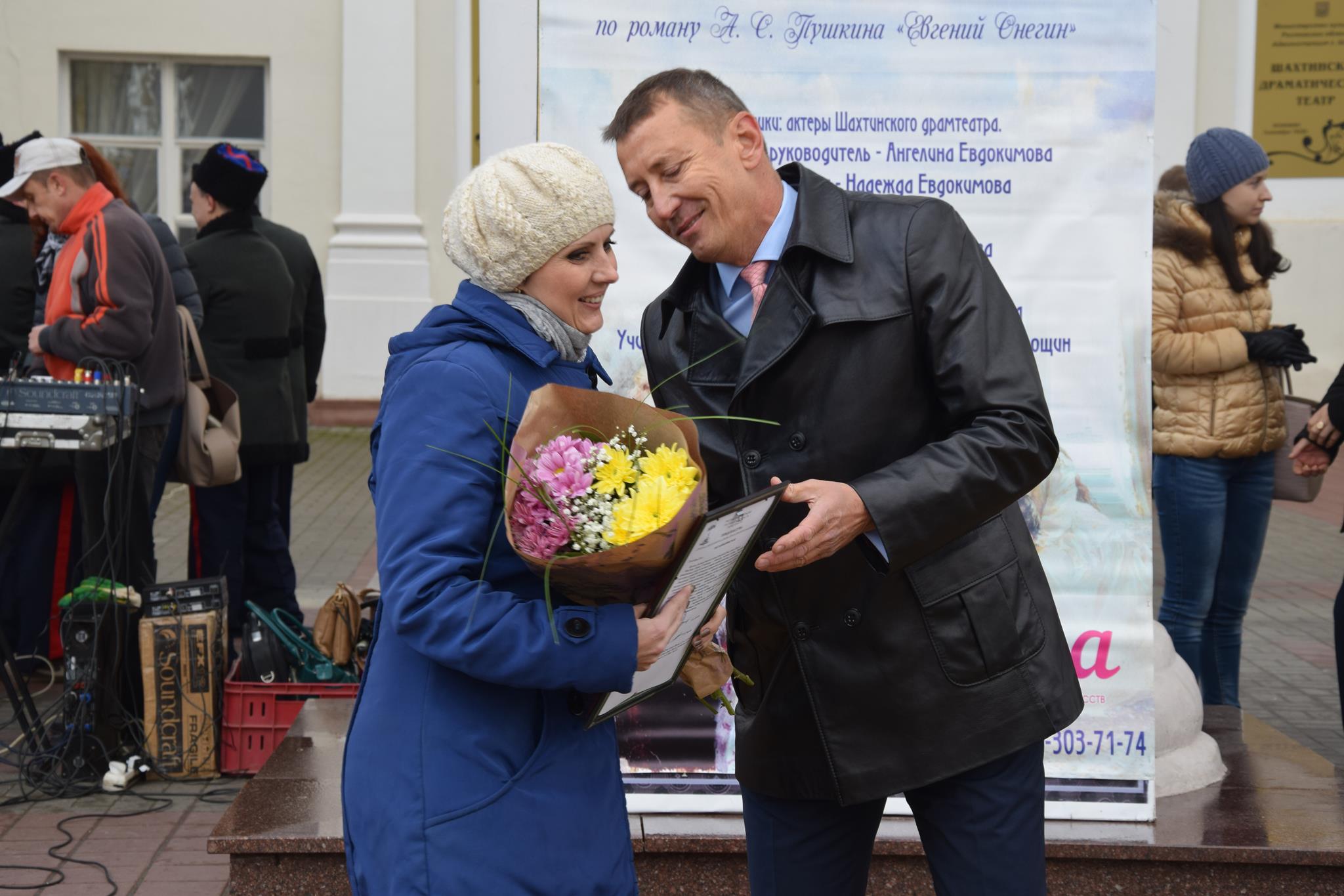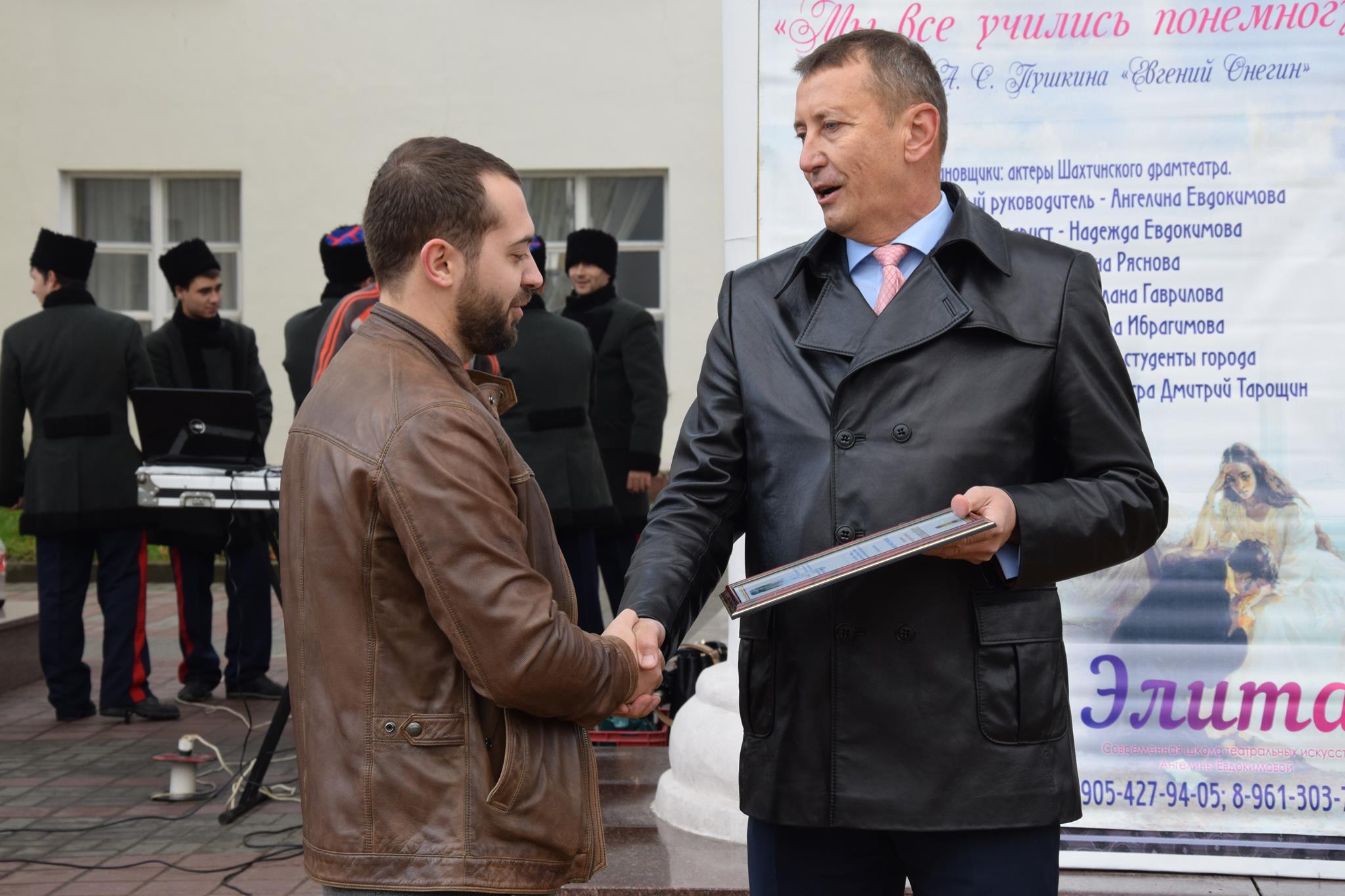 Алексей Тушминцев, Дмитрий Кравцов и Владимир Жемойтель вручили Благодарственные письма достойным шахтинцам, коллектив муниципального ансамбля «Надежда» и другие талантливые артисты подарили присутствующим замечательные песни. А члены Молодой гвардии угощали присутствующих очень вкусными пирогами, приготовленными специально для этого праздника на хлебопекарном предприятии семьи Кундрат.