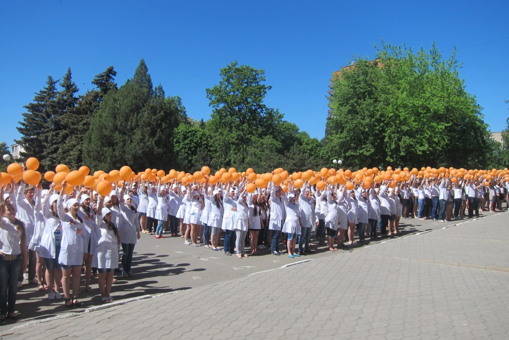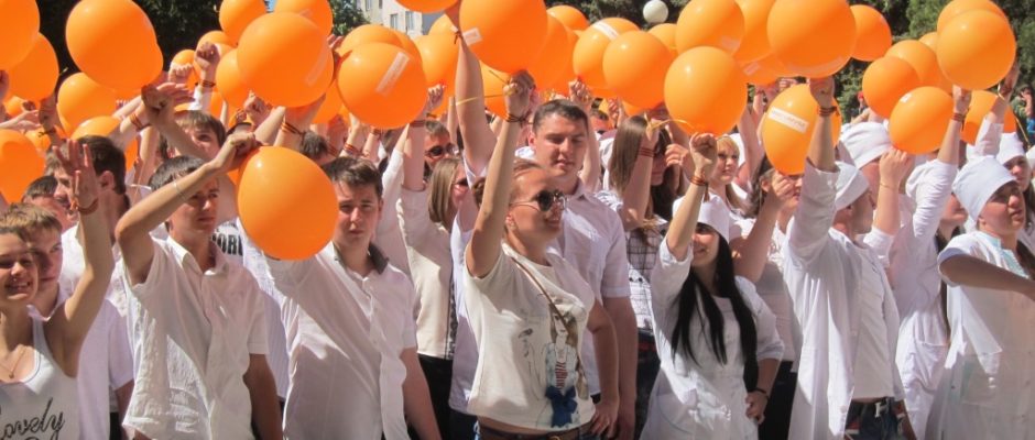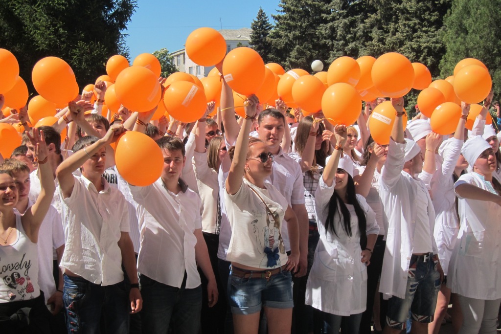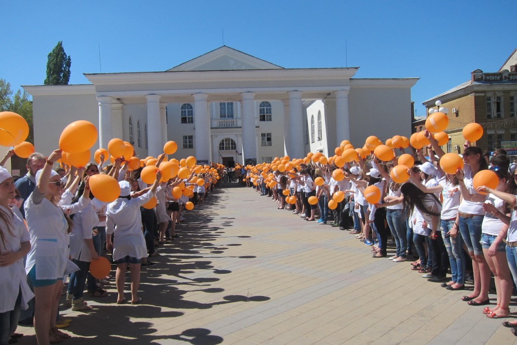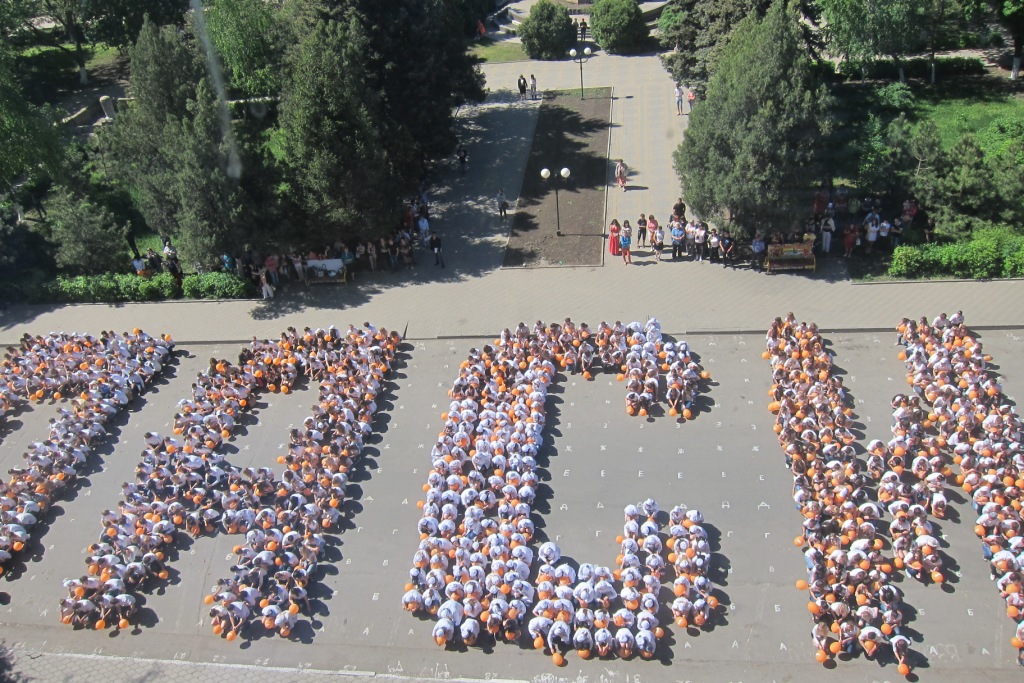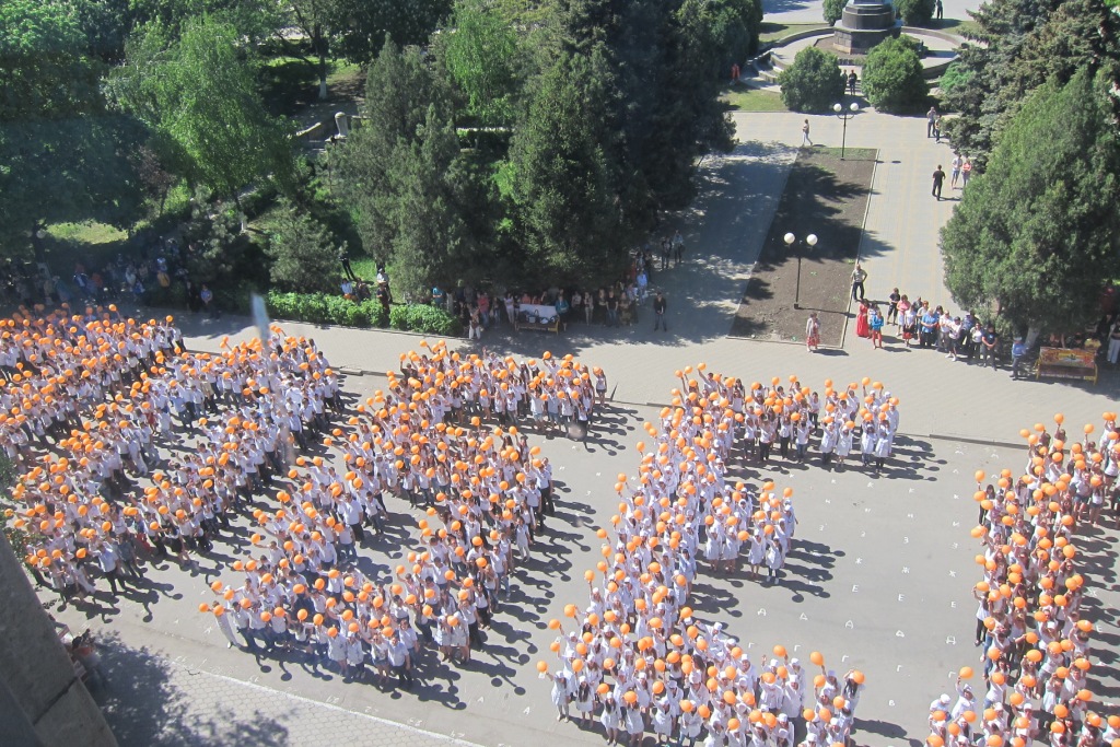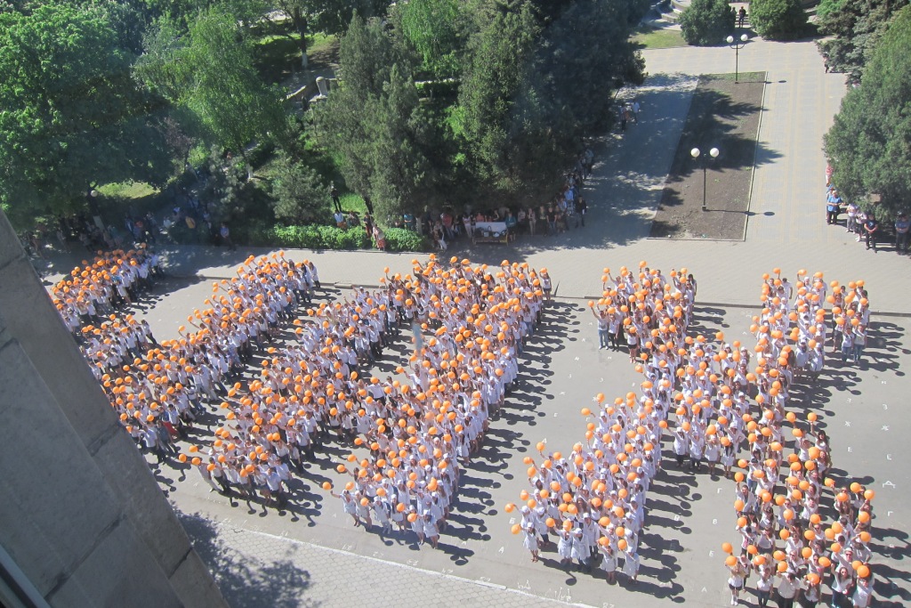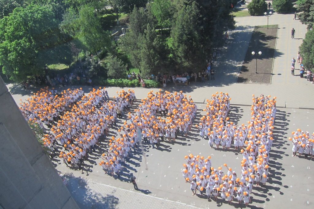 Эта необычная массовая акция уже становится неотъемлемой частью проведения праздничных торжеств в канун празднования Дня Победы. Около 1700 студентов ВУЗов, СУЗов, старшеклассников собрались для того, чтобы выстроиться в «живые» слова: «спасибо», «Победа», «Россия», «Шахты», «миру-мир», «жизнь». По команде организатора акции Василия Савина ребята быстро перемещались в заданных координатах и создавали слово, махали оранжевыми шарами и произносили речёвки, а главные зрители – ветераны – наблюдали за происходящим из окон здания, с высоты. Зрелище получилось впечатляющее, новое слово рождалось за пару минут! А потом ветераны вышли на ступеньки здания и сотни молодых людей вновь обрушили на них шквал эмоций: пели, танцевали, поздравляли с победой, выстроились в живой коридор, чтобы проводить ветеранов к автобусу, который отвёз их в театр на концерт. Массовая акция так «зарядила» всех её участников, что весь путь до театра они оглашали возгласами ликования, пели «Катюшу» и «День Победы», а шахтинцы им сигналили из машин, выходили на улицу, чтобы посмотреть на шумную и радостную молодёжь.