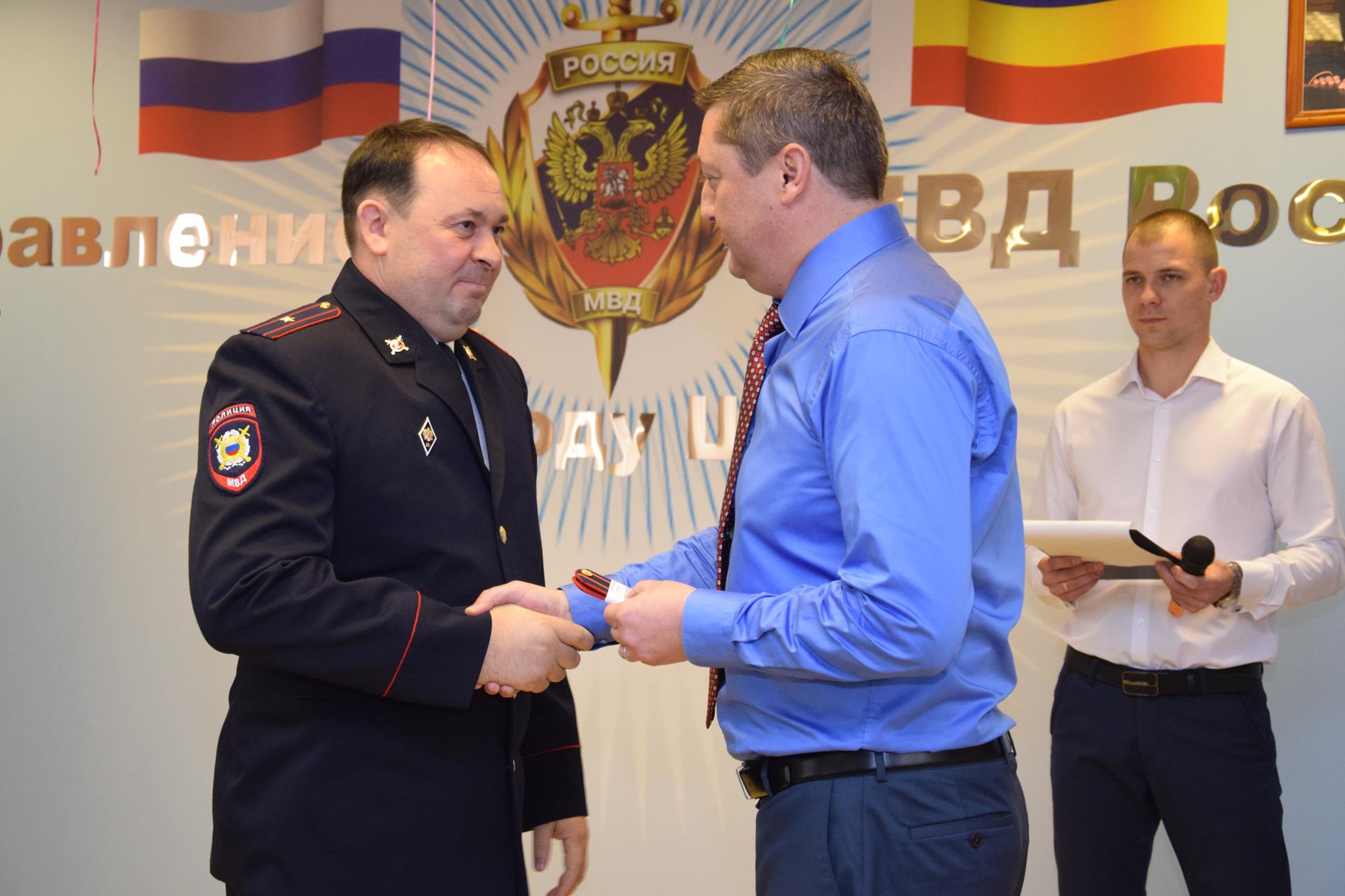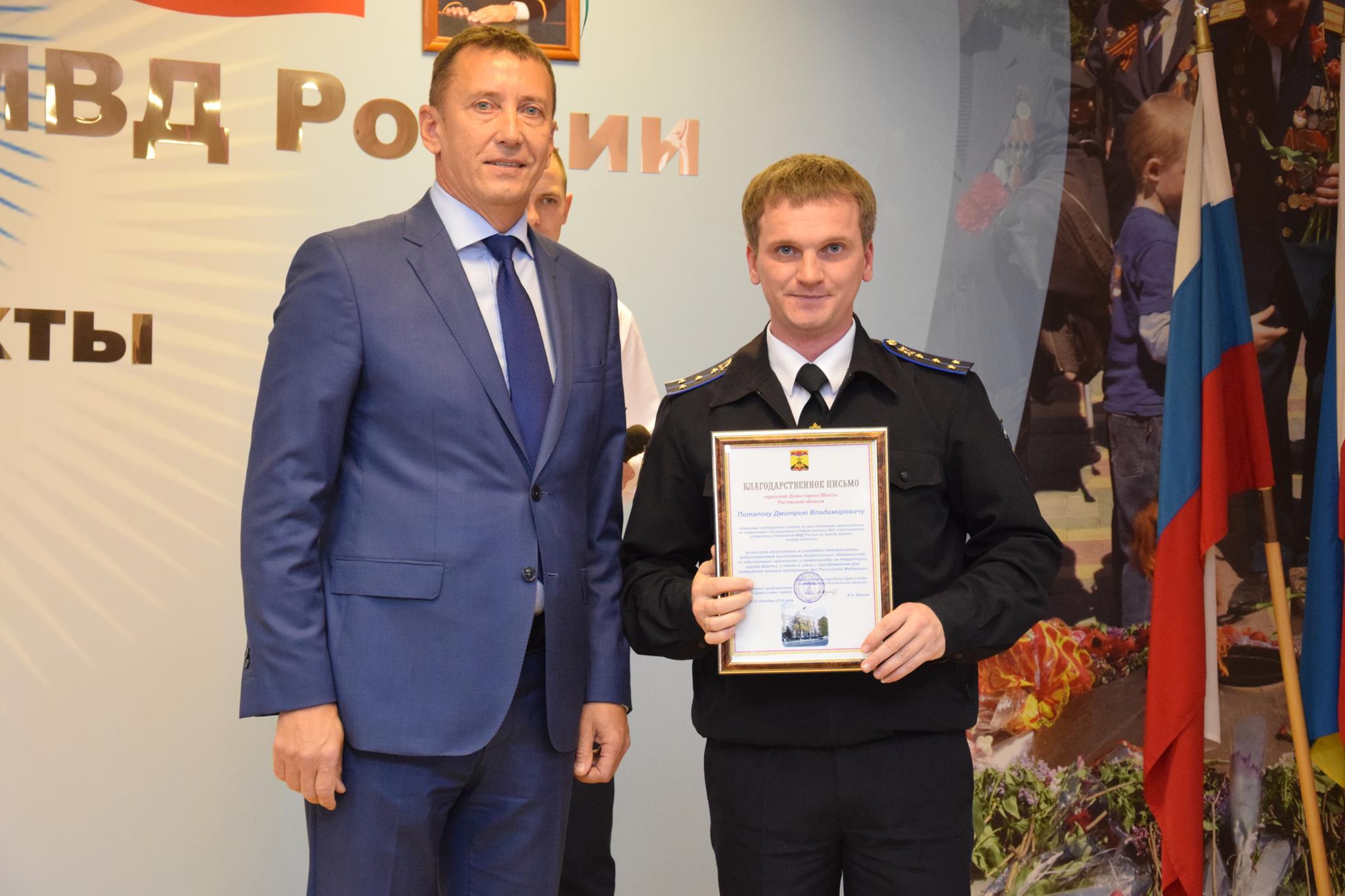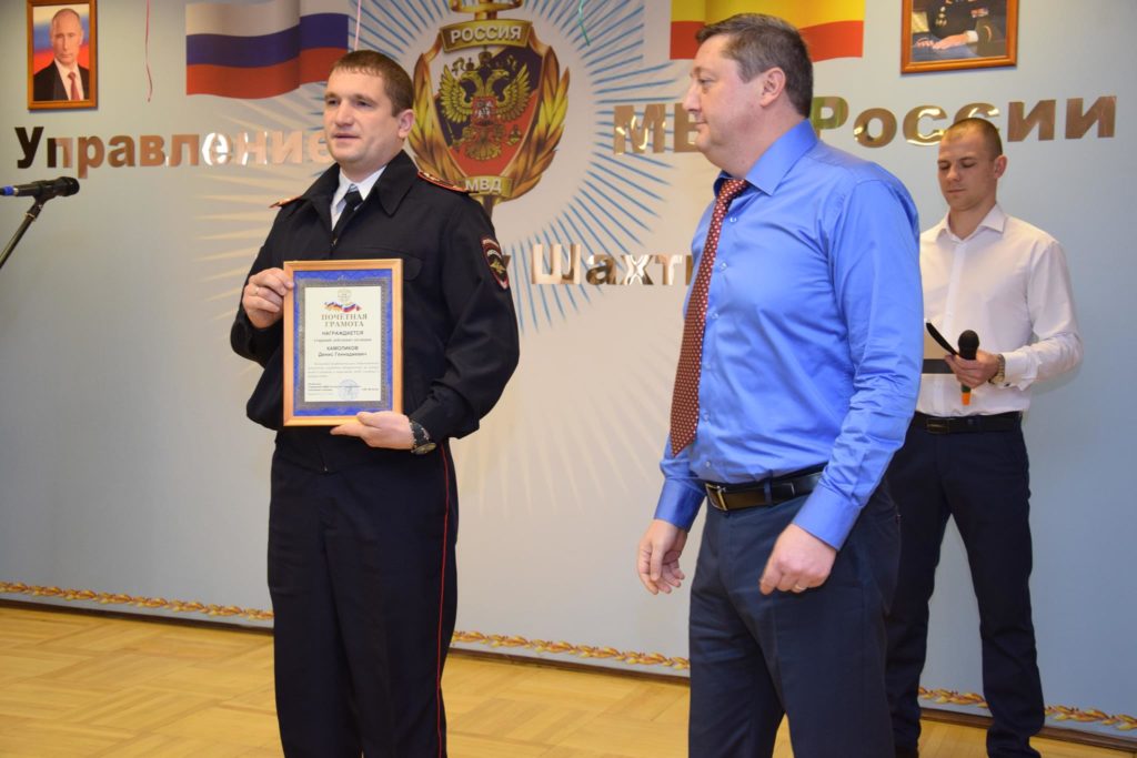 — Потапову Дмитрию Владимировичу – старшему следователю отдела по расследованию преступлений на территории обслуживания отдела полиции №3 следственного управления Управления МВД России по городу Шахты, майору юстиции — за высокие результаты в служебной деятельности, добросовестное выполнение должностных обязанностей по обеспечению законности и правопорядка на территории города Шахты, а также в связи с празднованием Дня сотрудника органов внутренних дел Российской Федерации;