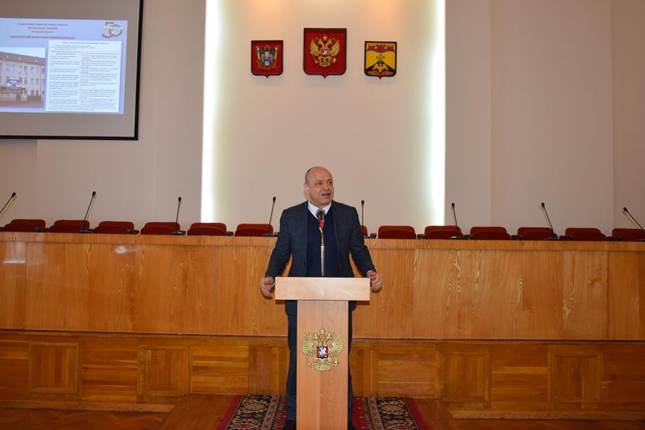 Торжество, посвященное 50-летию Шахтинского политехнического колледжа, состоялось в большом зале Администрации. Открыл мероприятие директор учебного заведения Игорь Головин, рассказав об истории учреждения, коллективе профессионалов, добившихся значимых успехов, социальных партнерах, в числе которых завод «Гидропривод».