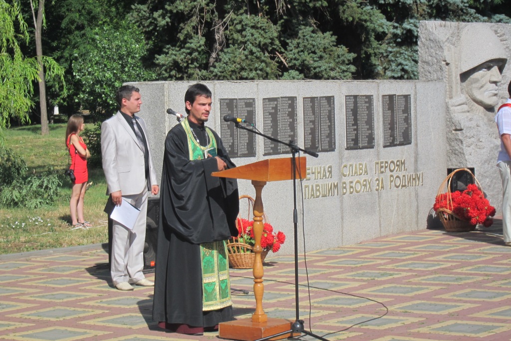Панихиду по погибшим отслужил священник Покровского кафедрального собора отец Дионисий. К подножию Братской могилы были возложены венки и цветы.