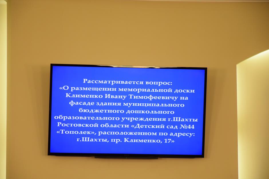 Также утверждено размещение мемориальной доски герою подпольного движения в годы оккупации фашистами города Шахты Клименко Ивану Тимофеевичу (на фасаде здания детского сада №44 «Тополёк», пр. Клименко, 17) – в рамках реализации инициативы донских парламентариев-единороссов «Улица Героя» (партийный проект «Единой России» «Историческая память»).