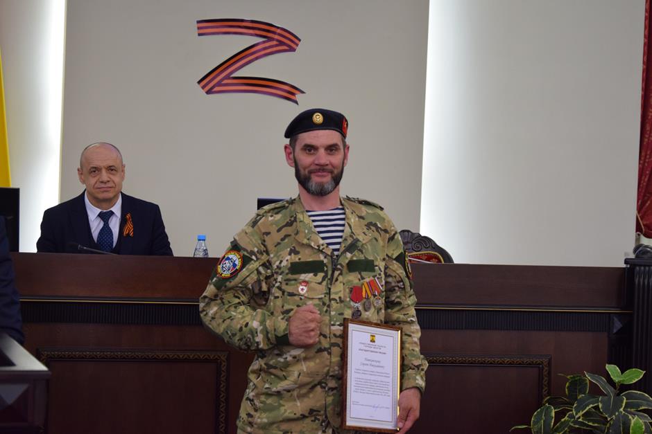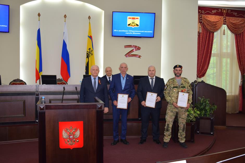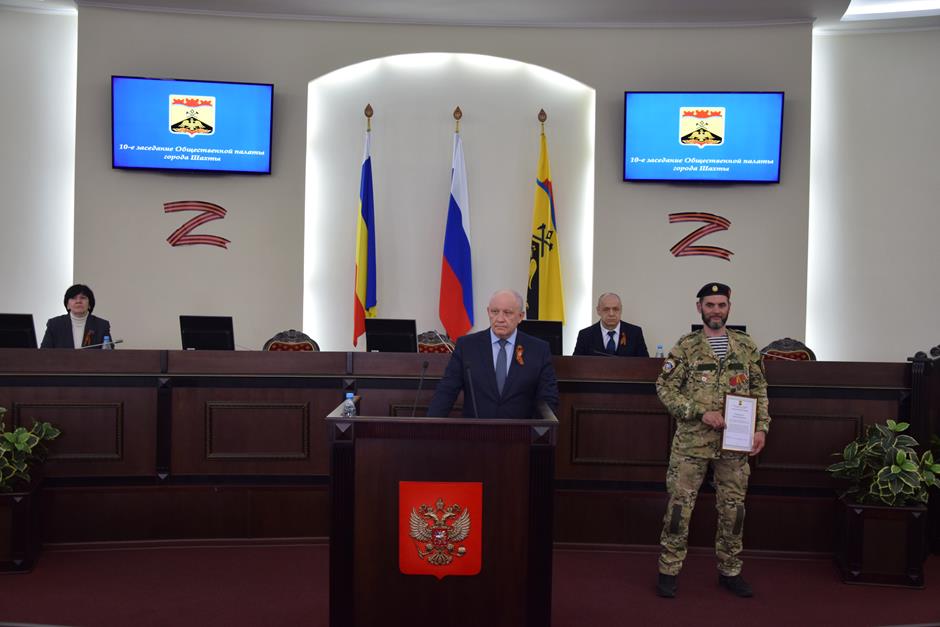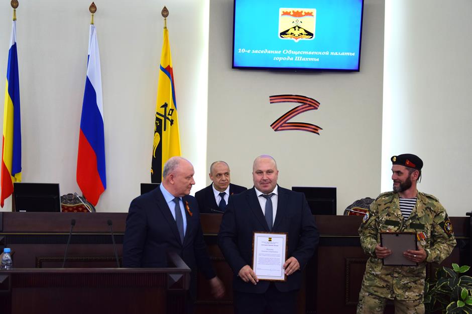 Предварила работу по повестке церемония награждения. В связи с празднованием 80-летия Великой Победы председатель ОП Александр Скориков вручил Благодарственные письма Общественной палаты ветеранам специальной военной операции Евгению Маликову и Сергею Пашковскому; заместителю атамана – начальнику штаба ШГКО «Александровск – Грушевское» Виктору Лукьянчикову.
