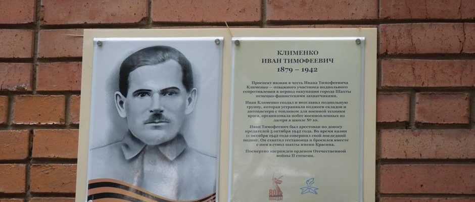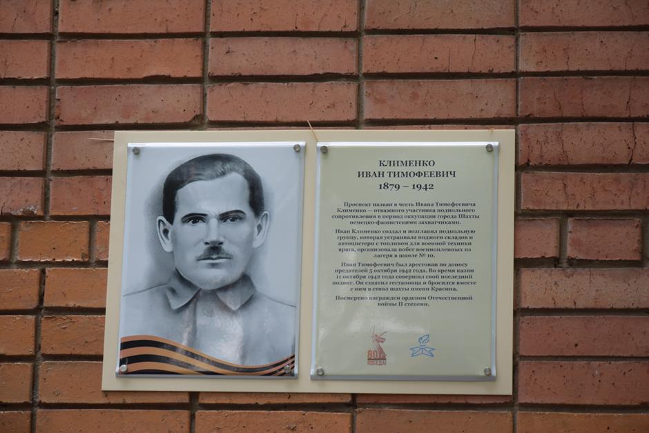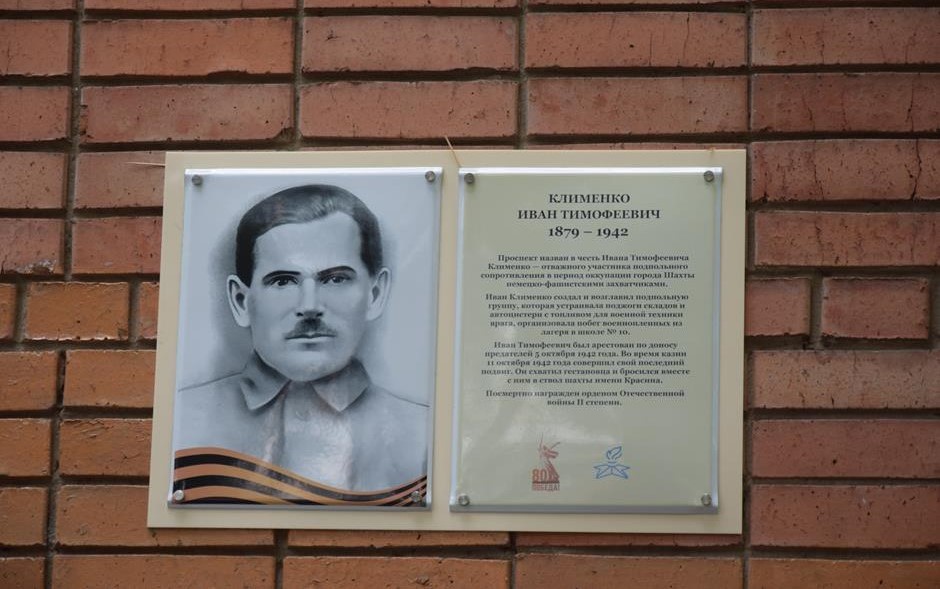 В рамках реализации инициативы донских парламентариев–единороссов «Улица Героя» (партийный проект «Единой России» «Историческая память») на фасаде здания детского сада №44 «Тополек» 6 мая открыли мемориальную доску герою подпольного движения в годы оккупации фашистами города Шахты Ивану Тимофеевичу Клименко.