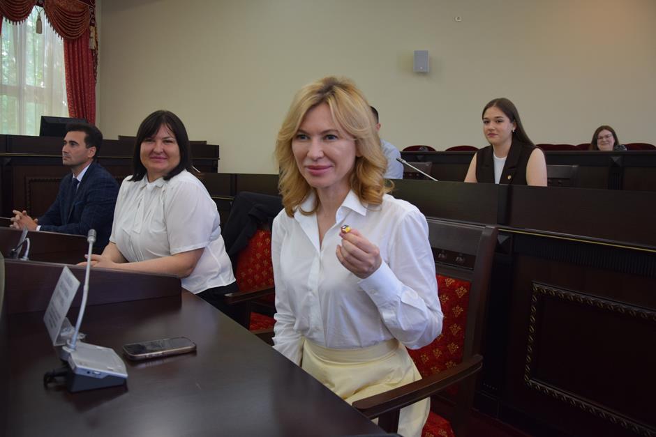 Члены нового состава МПШ также получили нагрудные знаки – они изготовлены по инициативе 9-го созыва и являются теперь атрибутом молодых парламентариев. Отличительный символ (депутатский значок) вручили и Екатерине Стенякиной, занимавшей пост председателя МПШ 2-го созыва.