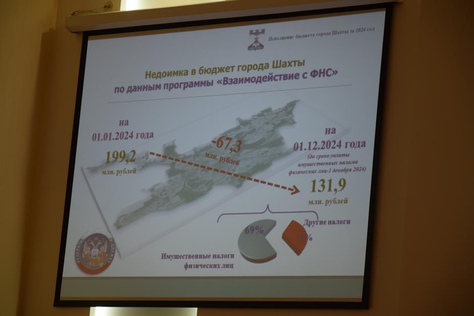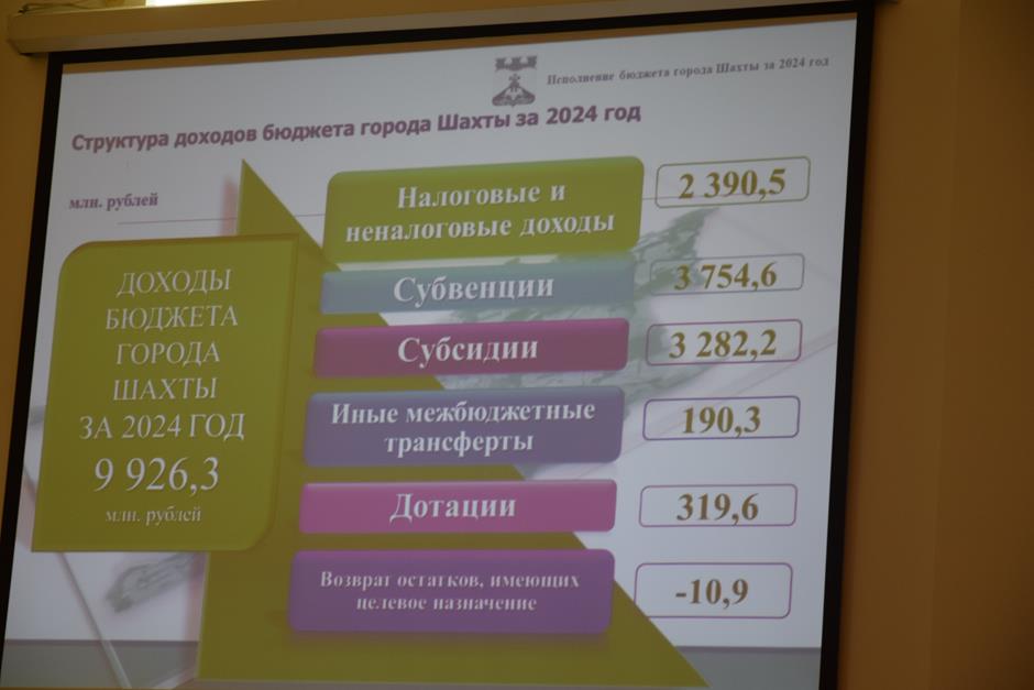 Основные отчетные показатели главного финансового документа города прозвучали в докладе и.о. директора Департамента финансов Сергея Васильева. В 2024 году в местный бюджет поступило 9 926 258,8 тыс. рублей доходов. Сумма налоговых и неналоговых доходов составила 2 390 466,6 тыс. рублей. Реализуется План мероприятий по росту доходного потенциала муниципального образования «Город Шахты». Комплексные меры — совместно с Межрайонной ИФНС России №12 по Ростовской области и службой судебных приставов — по работе с должниками позволили пополнить городскую казну на 11 509,7 тыс. рублей,в результате рейдов к 74 налогоплательщикам погашена задолженность на 931,9 тыс. рублей. Признана безнадежной к взысканию и списана недоимка 7 организаций в сумме 41 998,3 тыс. рублей.