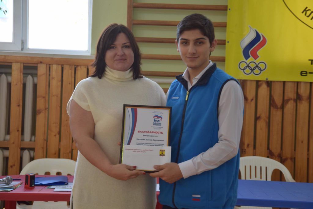 Ирина Жукова вручила Благодарность депутатского объединения «Единой России» в городской Думе Давиду Назаряну — за высокие спортивные достижения, большой личный вклад в развитие физической культуры и спорта на территории города Шахты, пропаганду здорового образа жизни. Давид тренируется под руководством А.Б.Смирнова в клубе ВБИ «Кумган» СШОР №15, является бронзовым призером Первенства России (2012 год), двукратным победителем первенства России среди юниоров (2015 год), серебряным призером Первенства Европы (2015 год, Латвия, Рига), бронзовым призером Первенства Мира (2016 год, Ванкувер, Канада).