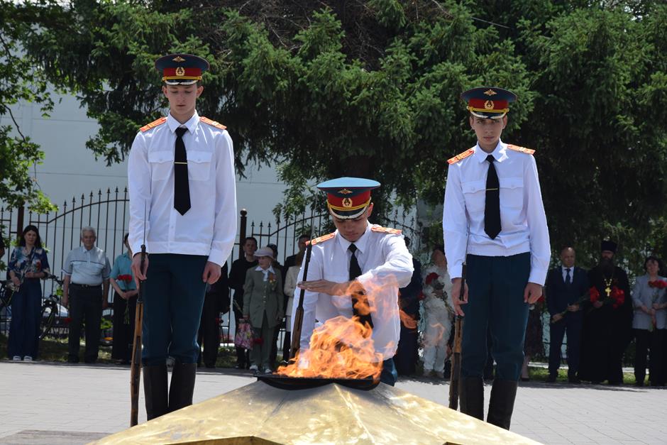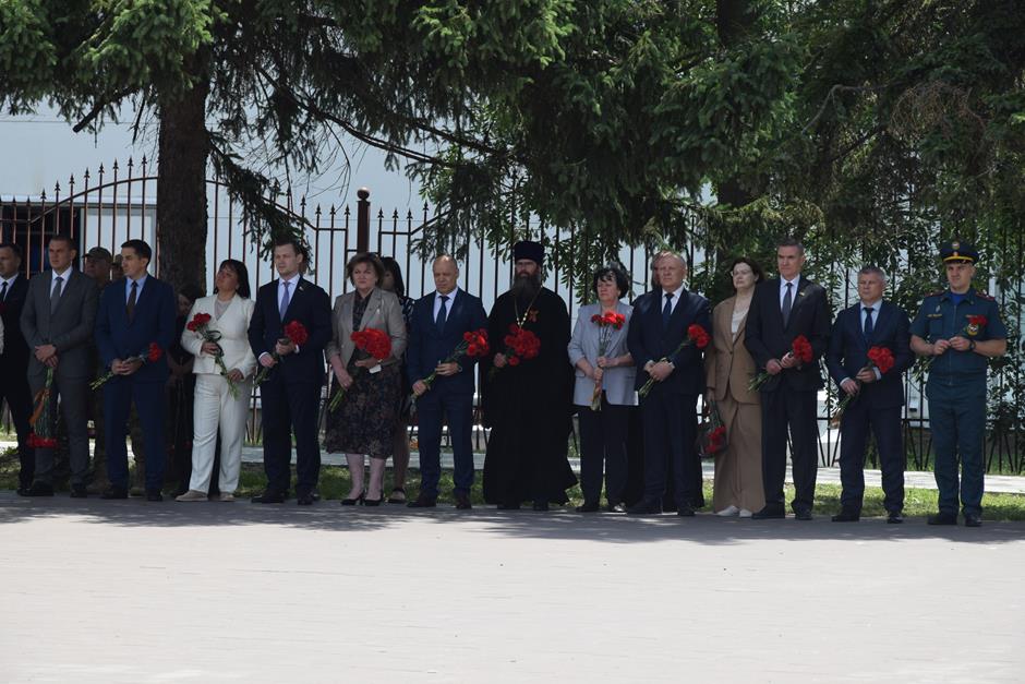 В знак преклонения перед ратным подвигом героев Великой Победы, гражданским мужеством российского воинства, доблестью защитников Отечества разных поколений к братской могиле собравшиеся возложили венки и цветы.