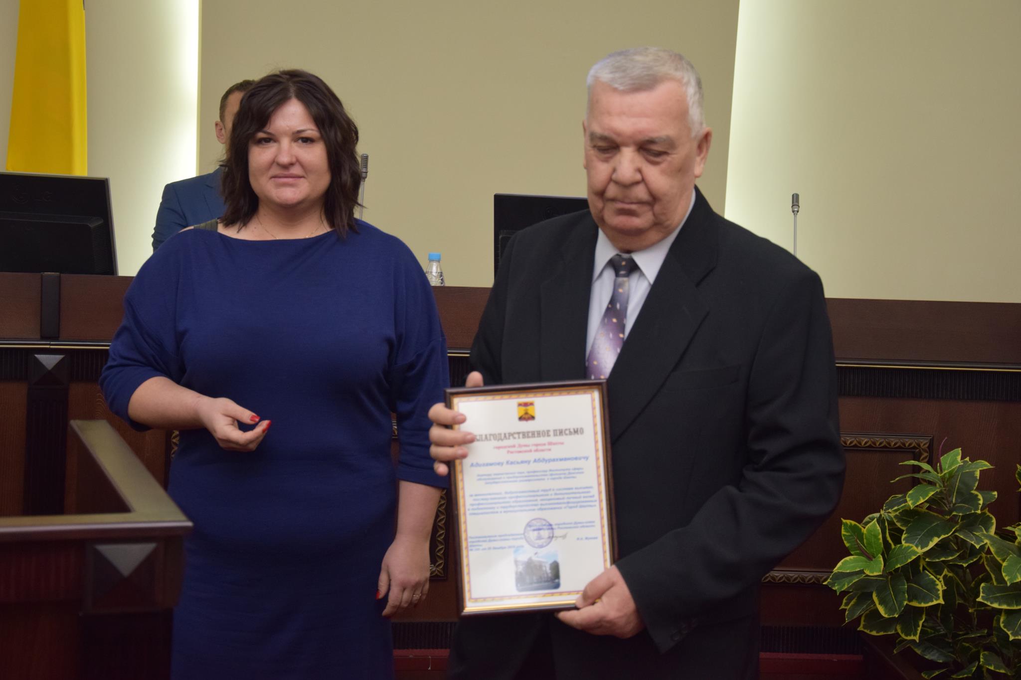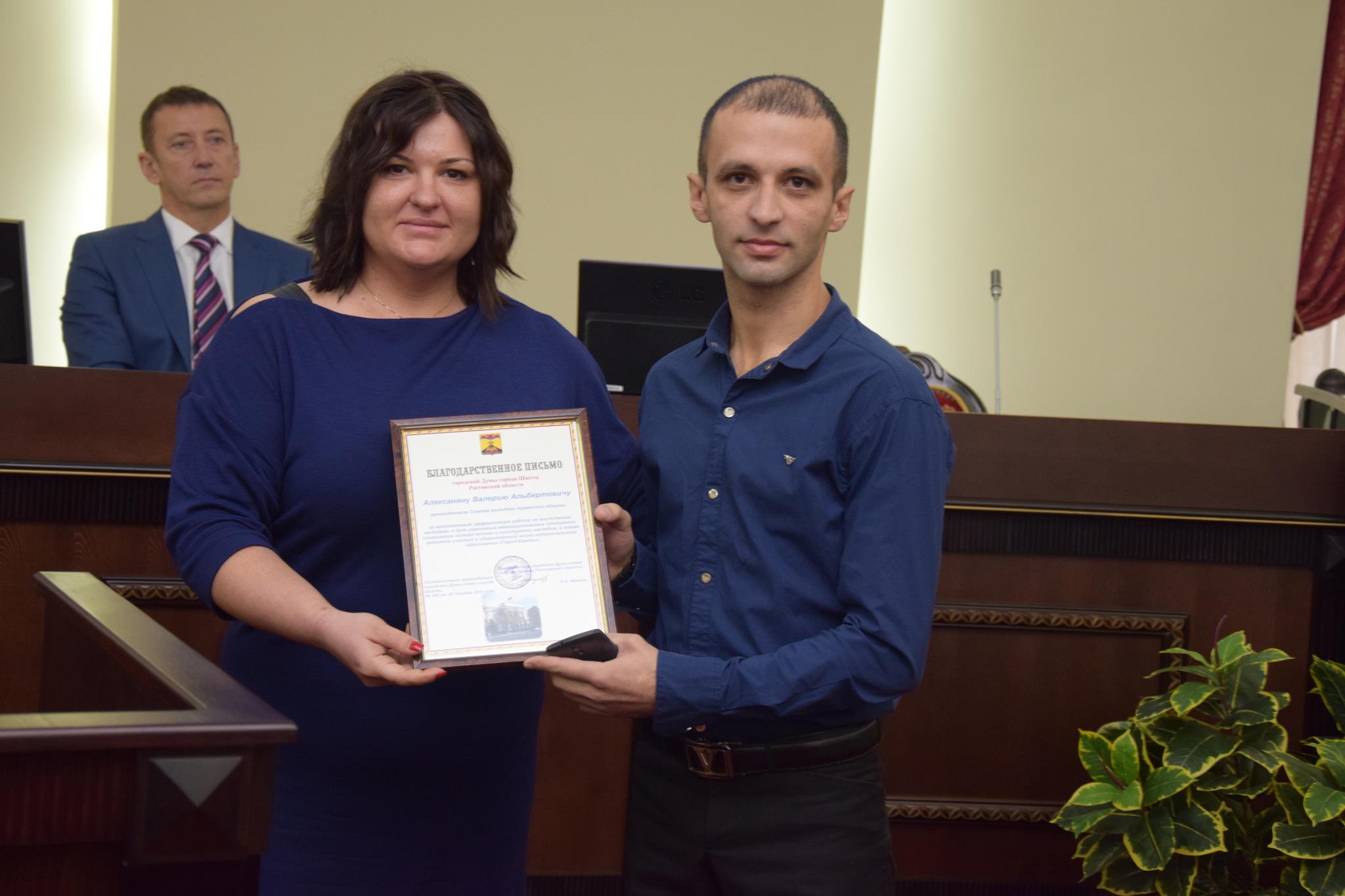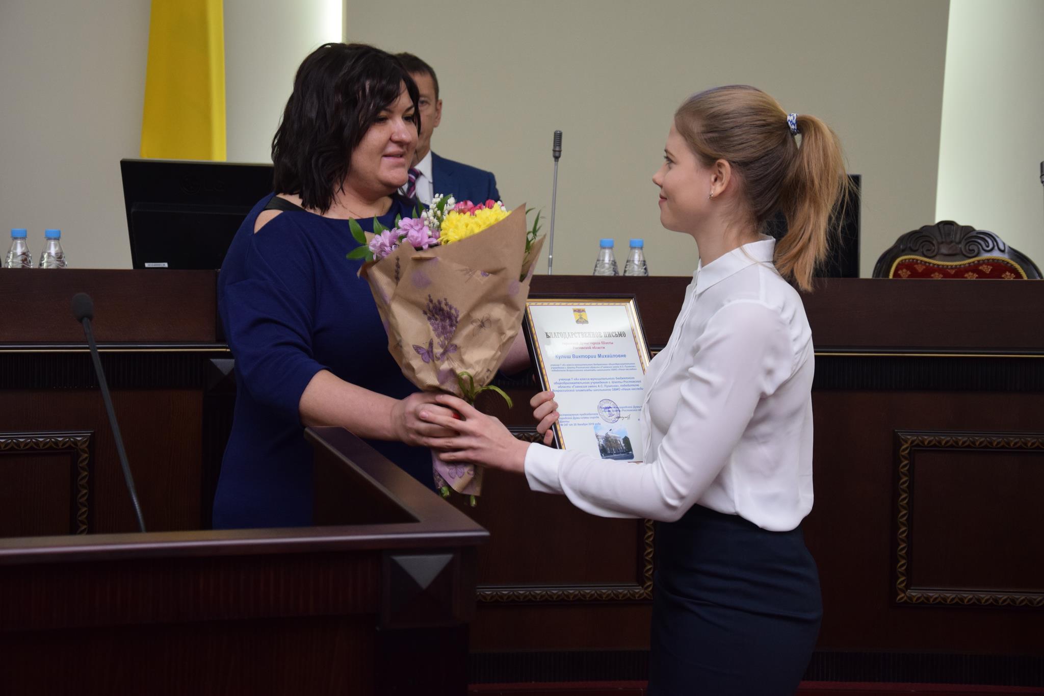 Перед началом рассмотрения основной повестки дня председатель городской Думы — глава города Шахты Ирина Жукова вручила Почетную грамоту городской Думы А.В.Поцелуевой, руководителю школы хип-хопа «Rock stil moves». А затем состоялась торжественная церемония вручения Благодарственных писем городской Думы, которыми были отмечены: