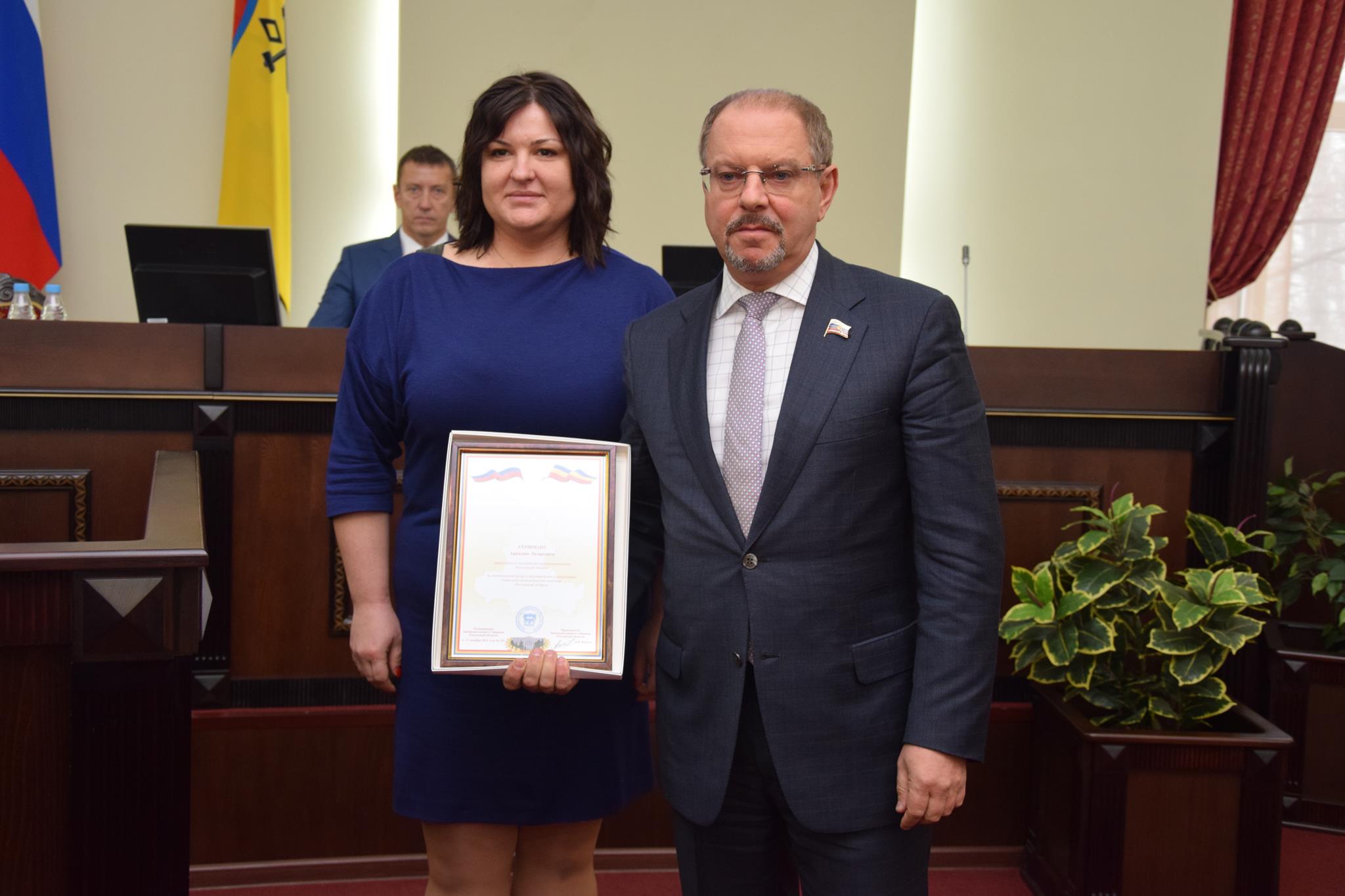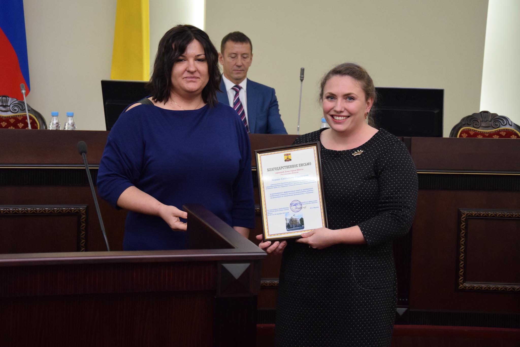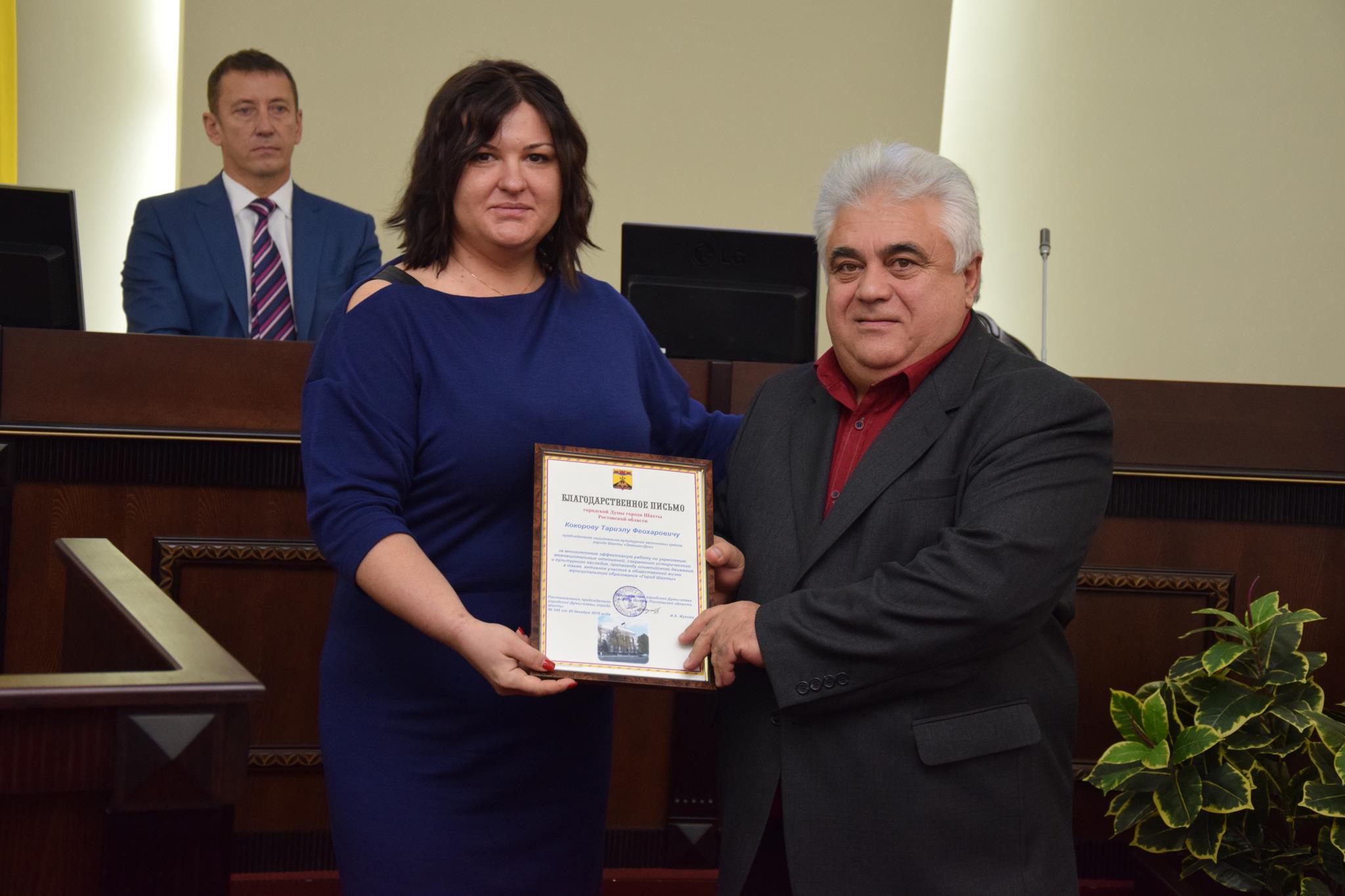 Перед началом рассмотрения основной повестки дня председатель городской Думы — глава города Шахты Ирина Жукова вручила Почетную грамоту городской Думы А.В.Поцелуевой, руководителю школы хип-хопа «Rock stil moves». А затем состоялась торжественная церемония вручения Благодарственных писем городской Думы, которыми были отмечены: