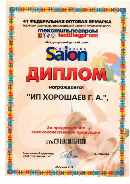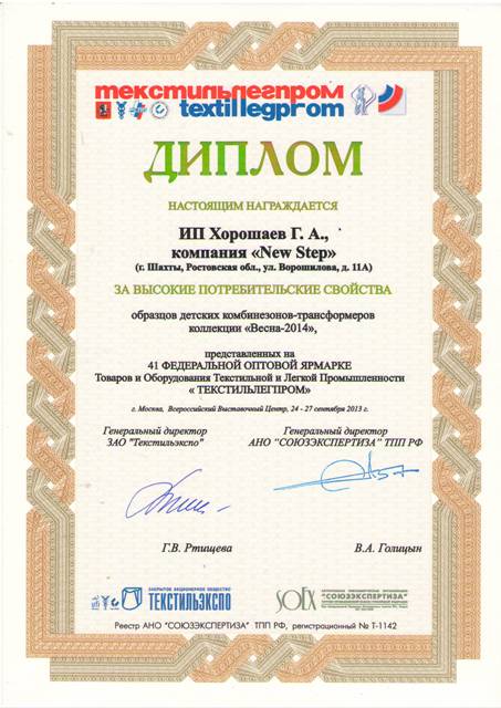Руководитель предприятия, член партии «Единая Россия» и депутат городской Думы Геннадий Анатольевич Хорошаев также удостоился почетного диплома «За большой вклад в формирование национального рынка товаров отечественного производства». Заявленные высокие потребительские характеристики продукции его компании подтверждены экспертными дипломами качества: «За представление высококачественной продукции», «За высокие потребительские свойства образцов детских комбинезонов-трансформеров в коллекции «Весна-2014». Вот что Г.А.Хорошаев рассказал об этой поездке в Москву: