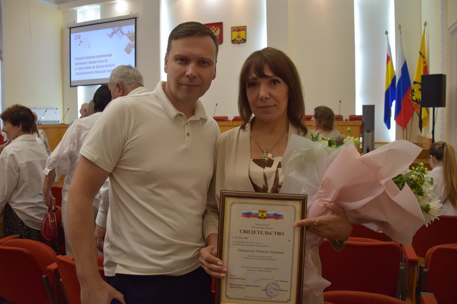 За решение значимых задач, весомый вклад в развитие сферы городской экономики, науки, культуры и искусства, физкультуры и спорта, воспитания, образования, охраны здоровья, жизни и прав граждан, плодотворную профессиональную, благотворительную и творческую деятельность свидетельства о занесении на Доску почета заслуженных граждан города Шахты вручены: