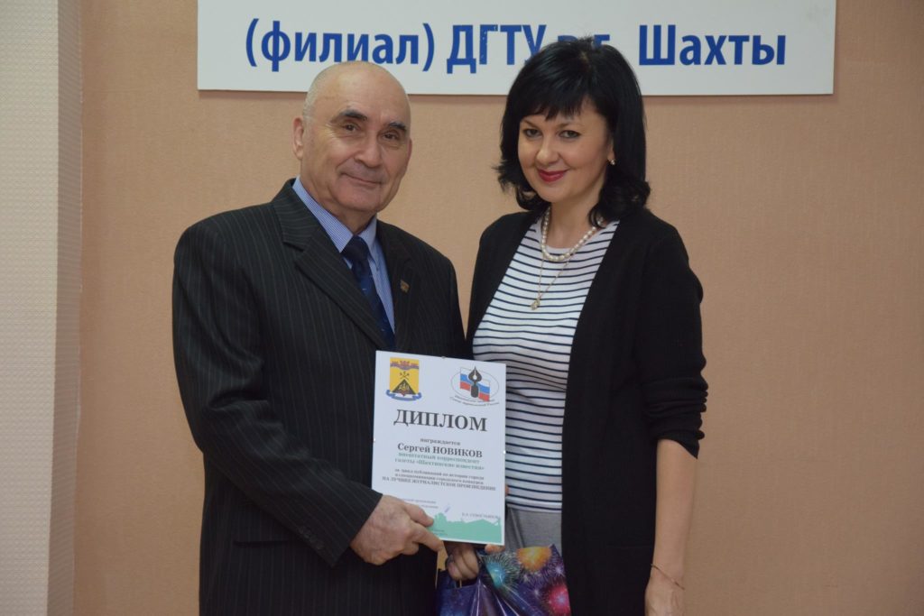 Конечно, какой праздник без премий и подарков! В этом году спонсорами конкурса среди журналистов в разных номинациях выступили депутаты городской Думы города Шахты. И победителям было очень приятно получать призы от Андрея Рябова, Алексея Тушминцева, Тенгиза Хиникадзе, Владимира Правдюка, Александра Скорикова, Ромена Даллари. Также вручали награды помощники депутатов Дмитрия Погребного, Дмитрия Приходько, Аркадия Гершмана. Праздник удался на славу! Порадовали всех гостей праздника своими песнями артисты муниципального ансамбля «Надежда».