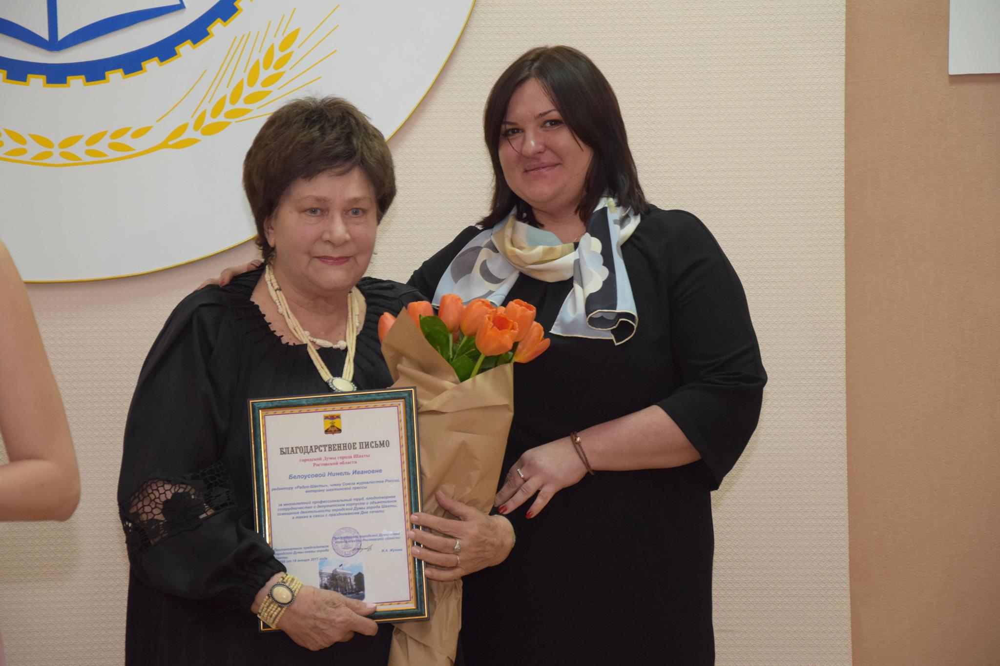 — Белоусовой Нинель Ивановне – редактору «Радио-Шахты», члену Союза журналистов России, ветерану шахтинской прессы за многолетний профессиональный труд, плодотворное сотрудничество с депутатским корпусом и объективное освещение деятельности городской Думы города Шахты, а также в связи с празднованием Дня печати;