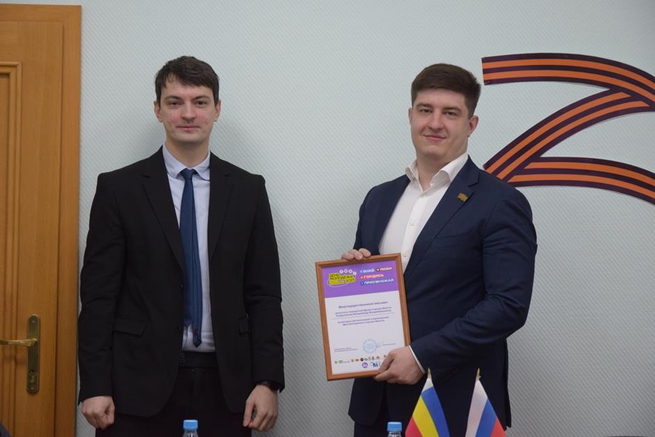 За взаимодействие и участие в подготовке и проведении мероприятий Роман Кочетков выразил признательность депутатам городской Думы: Максиму Голодову, Вадиму Новоселову, Артему Долгопятову, Константину Корнееву, Александру Петину, Олегу Данилову, Даниилу Федорцу, Ивану Партышеву, Николаю Марусину. За оказанную поддержку Владимир Андреянов удостоен Благодарственного письма отдела по молодежной политике.