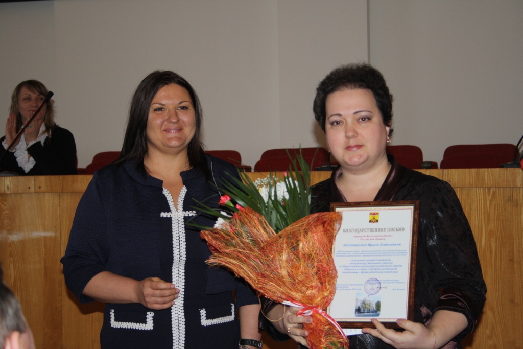 Председатель городской Думы города Шахты И.А.Жукова наградила Благодарственными письмами Думы «За высокий профессионализм, инициативу, активное участие в общественно-культурном развитии города Шахты и в связи с профессиональным праздником – Днем работника культуры»: