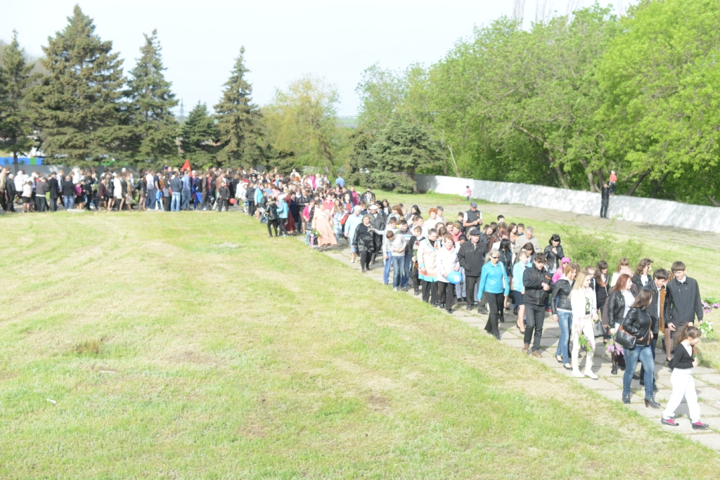 На митинг пришли несколько тысяч шахтинцев, в том числе ветераны, депутаты городской Думы, школьники, кадеты казачьего корпуса, жители посёлка. От лица молодёжи всех участников митинга поздравила заместитель председателя Молодёжного парламента Екатерина Смолякова, заверившая ветеранов в том, что молодёжь не забудет подвига своего народа. А потом состоялось возложение цветов к братской могиле и к монументу Солдата-освободителя. Живая колонна растянулась на несколько сот метров – люди с цветами, с георгиевскими ленточками на груди. Казалось, что на митинг вышла большая часть населения посёлка Красина! А в это время победный марш отбивали юные барабанщики кадетского корпуса на больших белых барабанах.