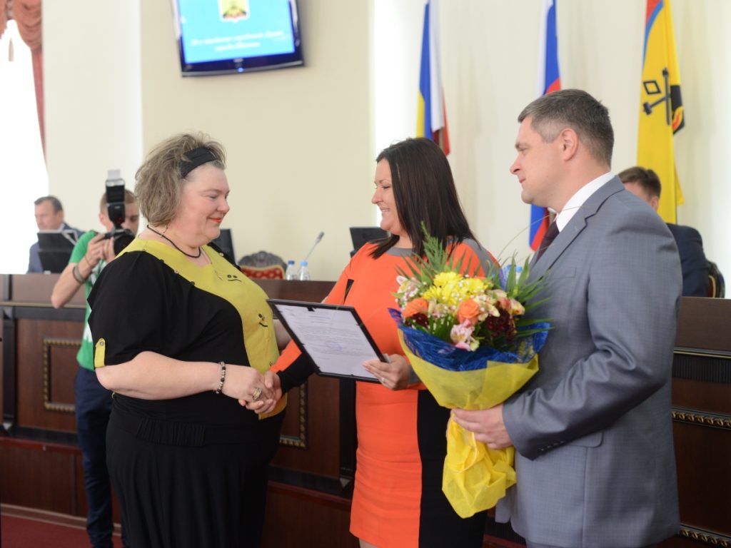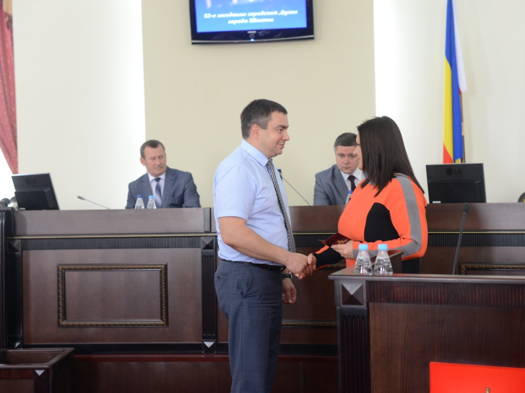 Заседание Думы началось с приятной церемонии вручения Благодарственных писем городской Думы города Шахты. За многолетнюю плодотворную работу, большой вклад в развитие культурной жизни города Шахты, организацию и проведение мероприятия, посвященного 20-летию городской Думы города Шахты, председатель Думы Ирина Жукова и мэр Денис Станиславов вручили благодарственные письма и цветы директору департамента культуры Светлане Морозовой и её заместителю Татьяне Кривовой.