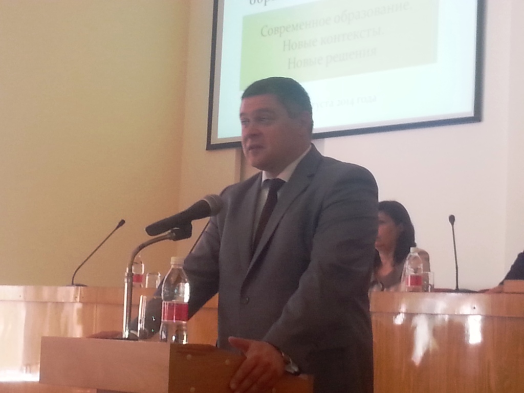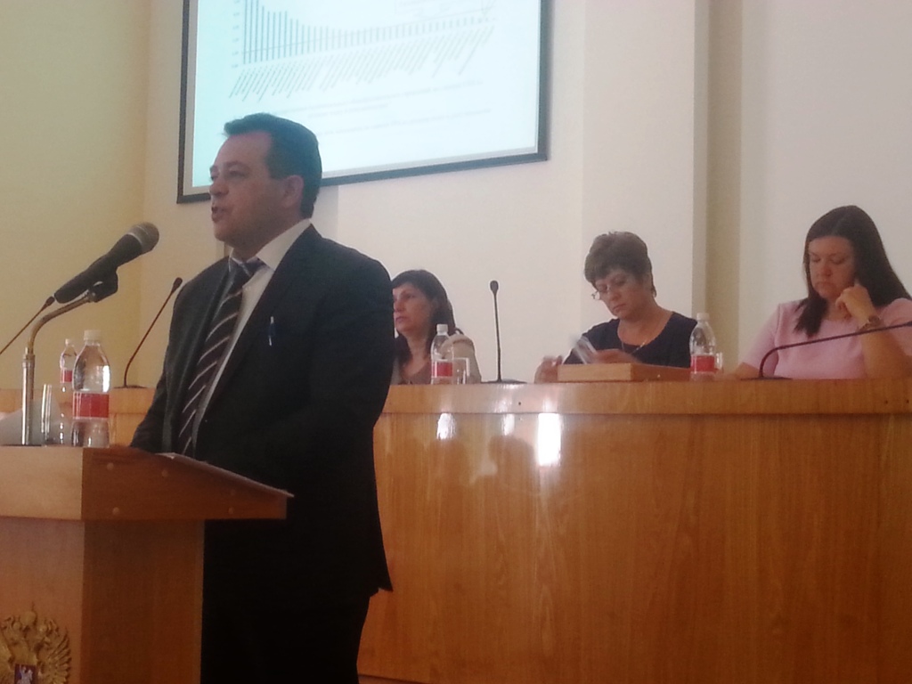 Далее конференцию продолжил директор департамента образования Станислав Воробьев с докладом «Реализация переданных государственных полномочий в управлении муниципальным образовательным комплексом».