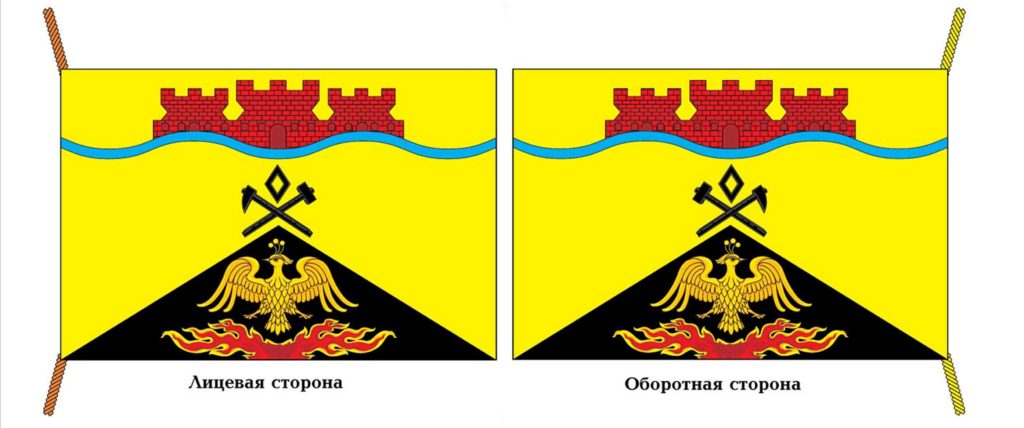 Положенные в центре полотнища фигуры символизируют отрасли промышленности, сыгравшие ключевую роль в становлении и развитии города: